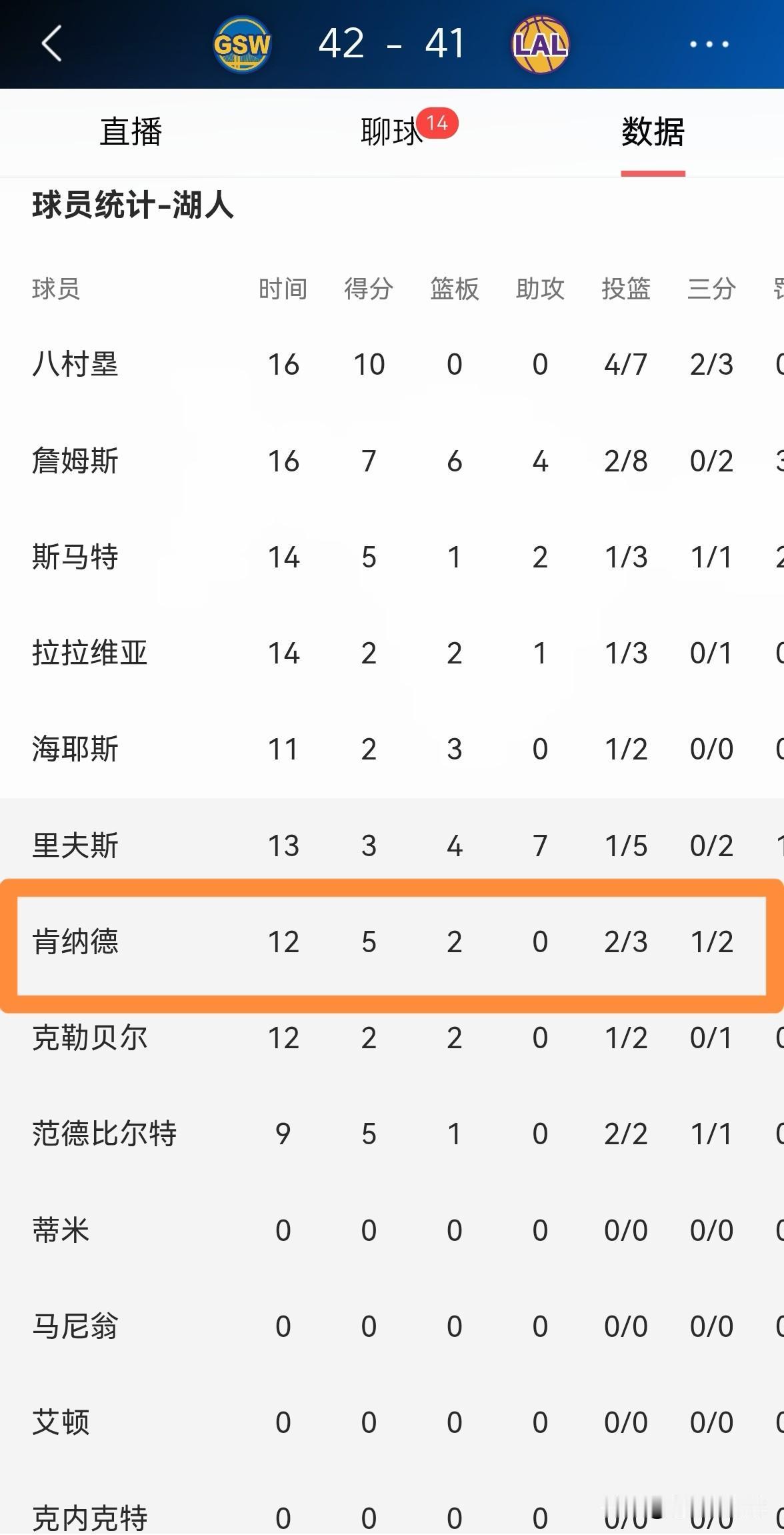 湖人新援肯纳德真是球队的完美补充!在今天进行的湖人和勇士的比赛中,目前双方的上半场比赛已经结束,虽然湖人以41:42落后于对手,但是首次代表湖人出战的肯纳德却不负众望,打出了球队期待的表现。 在前两节比赛中,肯纳德替补出战12分钟,投篮3中2,其中三分球2中1得到5分2篮板1抢断,他的场上正负值为+2。 坦白说,从肯纳德在上半场比赛中的表现来看,他真的特别适合湖人的体系,他在湖人的体系中简直是如鱼得水。