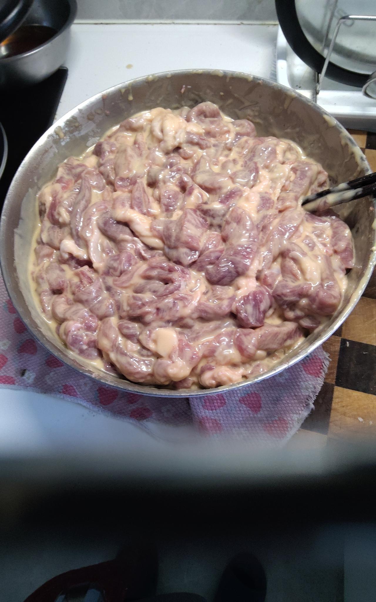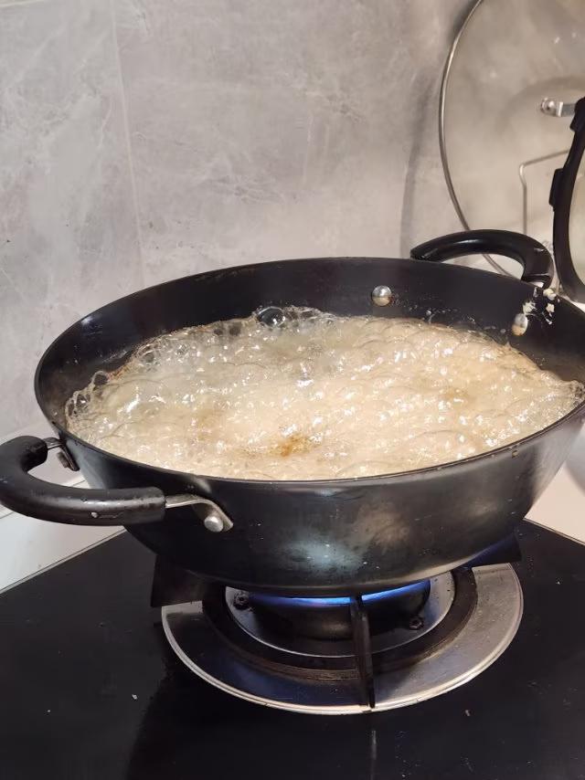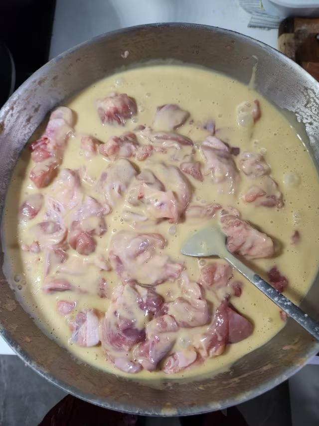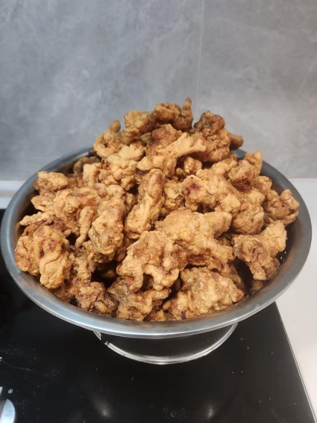过年了 怎样“过油炸菜”香又脆 以前,每到过年要“过油”炸菜,这老传统如今仍有,让孩子们过一下与平时不一样的生活。 那么怎样使油炸猪肉、鸡肉香又脆呢?看看我的做法好不好? 食材:买了肥瘦相间的前腿猪肉8斤、鸡腿6斤。 调料:红薯粉、面粉、食用油、盐、鸡蛋、葱、姜、花椒壳、五香粉、白糖、味精。 做法: 1、先把清洗好的猪肉切成2厘米薄片、再切成条;鸡腿跺成3块备用。 2、准备葱、姜、花椒壳调料水:碗中加入温水,把葱花、姜片、花椒壳少许泡水并搅均匀。 3、调料拌肉:切好的肉里加适量盐、五香粉、白糖、味精、搅均匀,再倒入约一小碗葱姜调料水,用手抓均匀,直到调料水全部吸入为准。 4、搅面糊:先把6个鸡蛋打在容器中,搅均匀后,加入红薯粉20克、面粉10克,(红薯粉能起酥、干的作用,面粉使粘糊度更加),继续打均匀,直到面糊打成:提起筷子能细条长流不断线为宜。如面糊太稀再加红薯粉,如太稠再加啤酒,啤酒使炸菜更酥脆,千万不要加水。 5、然后,把搅好的面糊倒入淹制好的肉条里,反复搅拌均匀,直到肉上都粘上面糊为准。 6、起锅烧油:以炸肉条为例,待花生油大火熬制8层热时,(加入食料时已冒泡)正式开始下入拌好的肉条,尽量做到一个一个的下入锅中,以防粘成一大块,待一会肉块半熟变硬些再翻动,如有粘着的,用筷子打一下即可散开。等肉条微黄、大致已熟时捞出。 7、复炸:复炸是使肉质更外酥里嫩,复炸时间我选择在第二锅出锅捞净时,这时第一锅的肉条已散热,接着插空把笫一锅应复炸的肉条再下入锅中复炸不到一分钟即可捞出。 8、这样就把外酥里嫩的肉条炸好了。孩子们准会都欢迎[捂脸][捂脸][捂脸] 大家看看我炸的年货炸菜怎么样?你们还有什么小妙招?评论区交流一下吧!