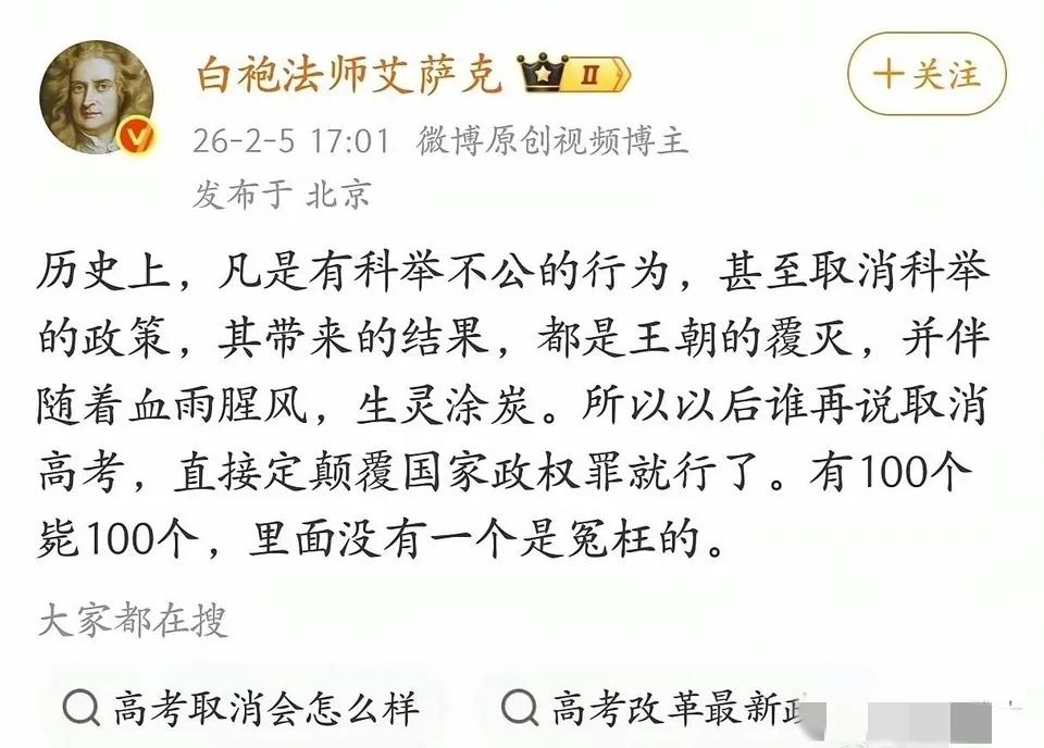 言辞虽然说得有些过激,但道理是说透了的。如果真的没有了高考,那么还有什么公平可言? 为什么不断有人攻击我们的教育制度,拼命呼吁取消中考和高考?原因很简单,这是因为总有那么一些人,他们做梦都想回到察举、征辟时代,回到“上品无寒门,下品无士族”的门阀时代,对选拔性考试深恶痛绝,因为一旦有了选拔性考试,就有可能出现“朝为田舍郎,暮登天子堂”的可能,世家大族便再也无法垄断社会资源了。 虽然说高考存在这样那样的缺点 但整体来说还是这个时代里相对公平的制度。我们可以对高考存在的缺点进行改正,但是取消高考是绝对不行的。无论孩子的成绩如何我们都支持高考,于私这是改变命运鲤鱼跃龙门的机会,于公这是给国家选拔真实人才的最好手段。 没有考试评分,学生怎么能争先恐后力争上游?学生不努力,怎么能够成才?考试是中华民族的优秀文化传统,是中华民族强于世界的制度保障。中国的快速崛起,有力地证明我们以前的教育制度是正确的。我们千万要守住民族文化自信,不要轻信西方“快乐教育”的忽悠!
