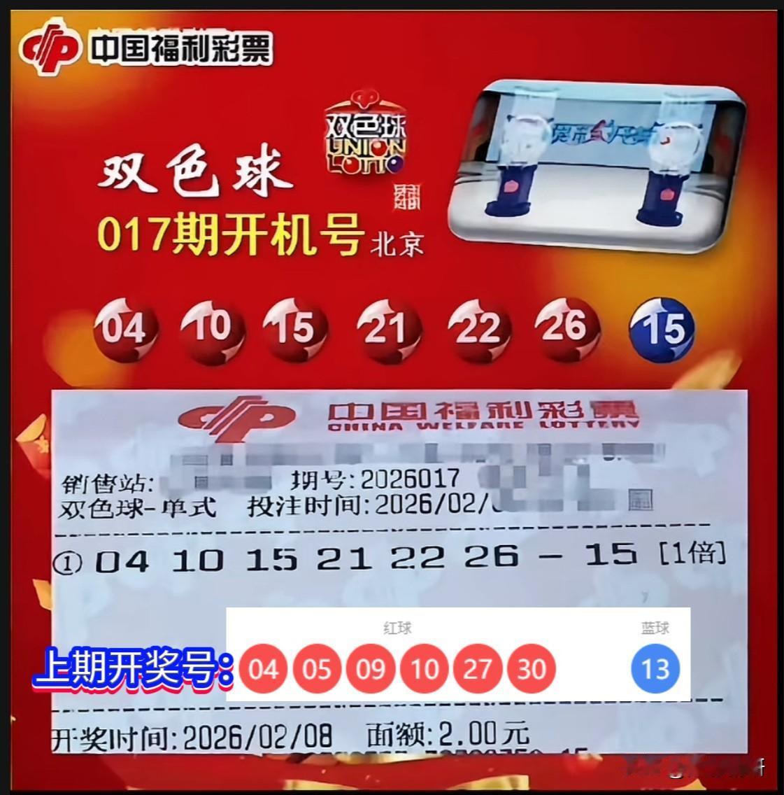 双色球第26017期开机号码正式公布:红球04、10、15、21、22、26,蓝球15。本期开机号呈现以下几大看点: 1. 红球方面,04与10双双落位重号,其中10更是连续三期现身,热度显著; 2. 连号组合21、22携手开出,形成小幅连号区间; 3. 斜连码26延续近期走势,衔接上期邻号; 4. 本期红球三区中,“3”字头大号集体断档,重心明显前移; 5. 蓝球开出最大奇数15,凸显继续大号走势。 春节将至,年前仅余最后3期开奖。目前奖池资金仍蓄积高达28亿多元,愿每位彩民都能在辞旧迎新之际,收获一份幸运,圆梦佳节,喜迎新春!