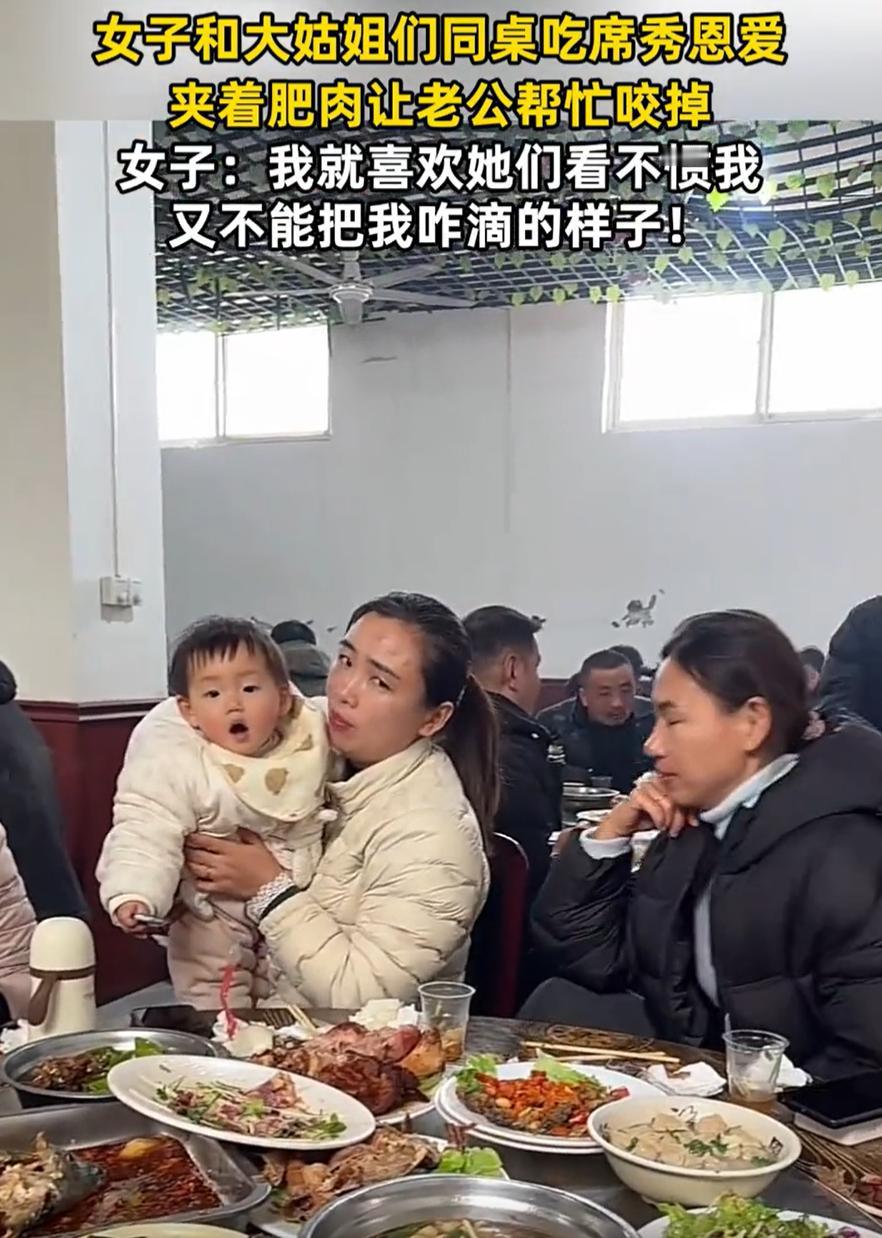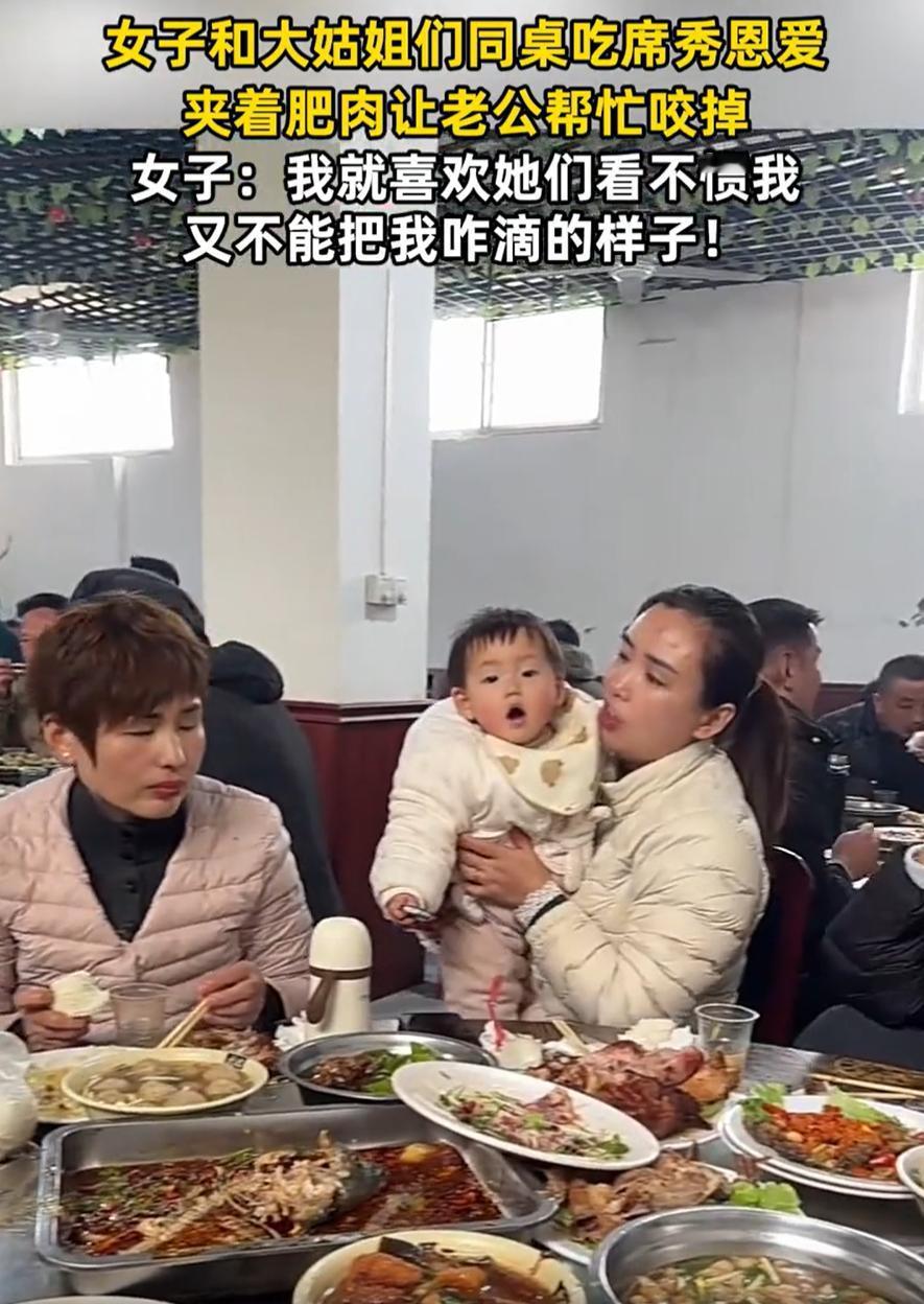 这不是故意拉仇恨吗?山东,女子和老公去参加酒席,刚好和大姑姐们坐一桌,期间女子突然夹起一块肉,当着众人的面让老公把肥肉咬下去,让桌上的气氛相当尴尬,但女子却觉得很过瘾:就喜欢她们看不惯我,又不能把我咋滴的样子 饭桌上并没有外人,只有四个大姑姐和女子夫妻二人,大家本来吃的已经差不多了,可这时女子突然从菜里面夹出一块肉递到老公嘴边,但她不是给老公吃的,而是让他把肥肉咬下去,老公也是很默契,只咬肥肉的那一块 看如此秀恩爱的方式,却让桌子上的大姑姐们很不舒服,四个人有无语的,甚至还有直接翻白眼的,意思可能是看不惯弟弟的样子 事后,女子把这个事发到了网上,也引起了不少网友的讨论 有网友说:很反感这种行为。在配偶的血亲面前,把配偶支配得团团转,又打又骂的,宣誓主权。就不能消停一会吗?你回家后怎么折腾他都行,但在他的血亲那里,请尊重其他人的感受吧 也有网友觉得没什么:夫妻之间一个愿打一个愿挨,旁人不必太敏感 其实这件事有意思的地方,不在“秀恩爱”本身,而在于那种微妙的“场合感”。家人饭桌,尤其是配偶原生家庭的饭桌,从来不止是吃饭那么简单 姐姐们眼里,弟弟或许还是小时候需要照顾的模样,如今看见他被妻子一个动作、一个眼神就指挥得团团转,心里难免有些不是滋味——那里面或许有护犊的心疼,也有对弟弟“长大了、属于别人了”的淡淡失落 而从妻子的角度看,这个举动或许并非单纯为了炫耀。在许多婚姻里,女方会不自觉地在婆家或夫家人面前,用一些细微的行为来确认自己的位置,试探丈夫的立场。让他咬掉肥肉,像是一个小小的测试:你愿不愿意在家人面前,依旧顺着我?通过这种带点表演性质的互动,她寻求的是一种安全感,一种“在你心里我优先”的验证 只是这种验证,往往把对方置于亲情与爱情的两难中。丈夫配合了,姐姐们心塞;丈夫不配合,妻子可能下不来台,总有不舒服的一方