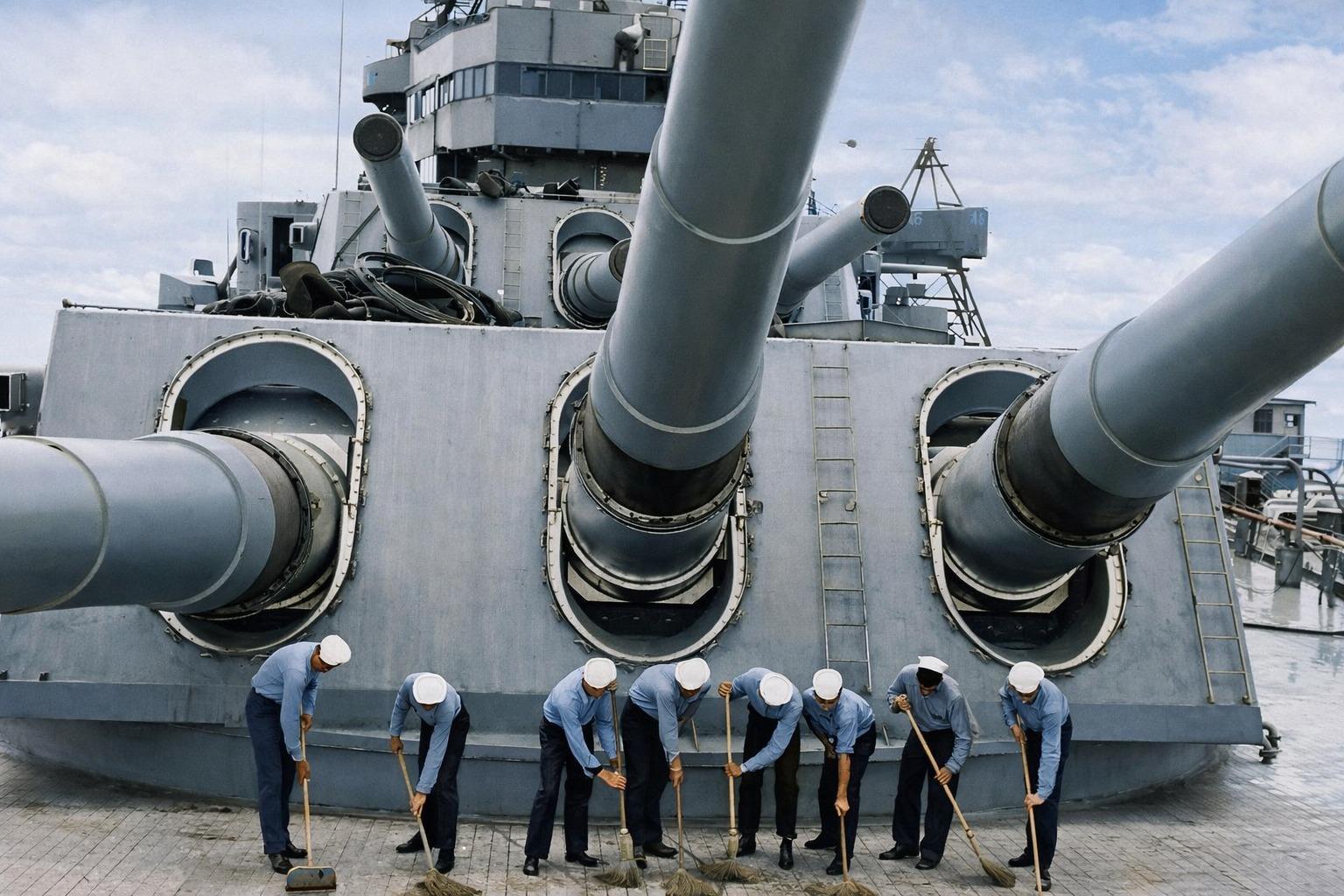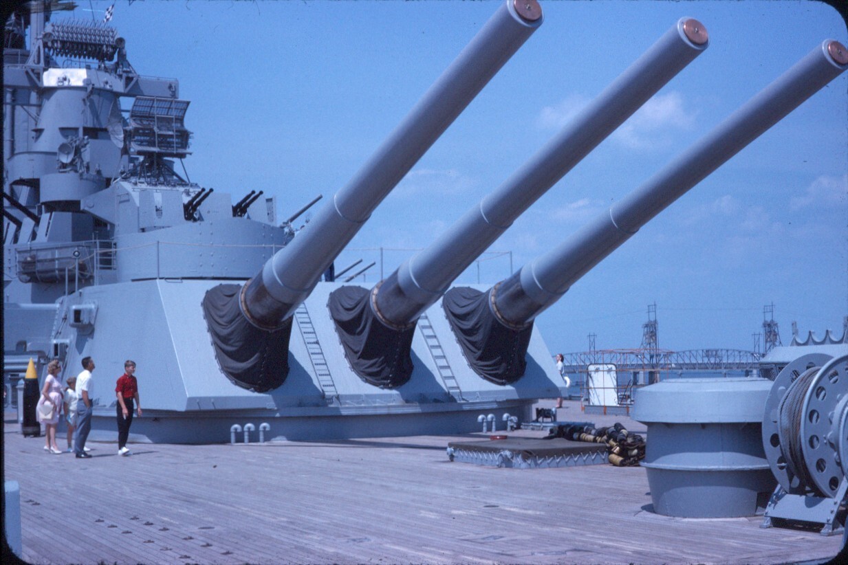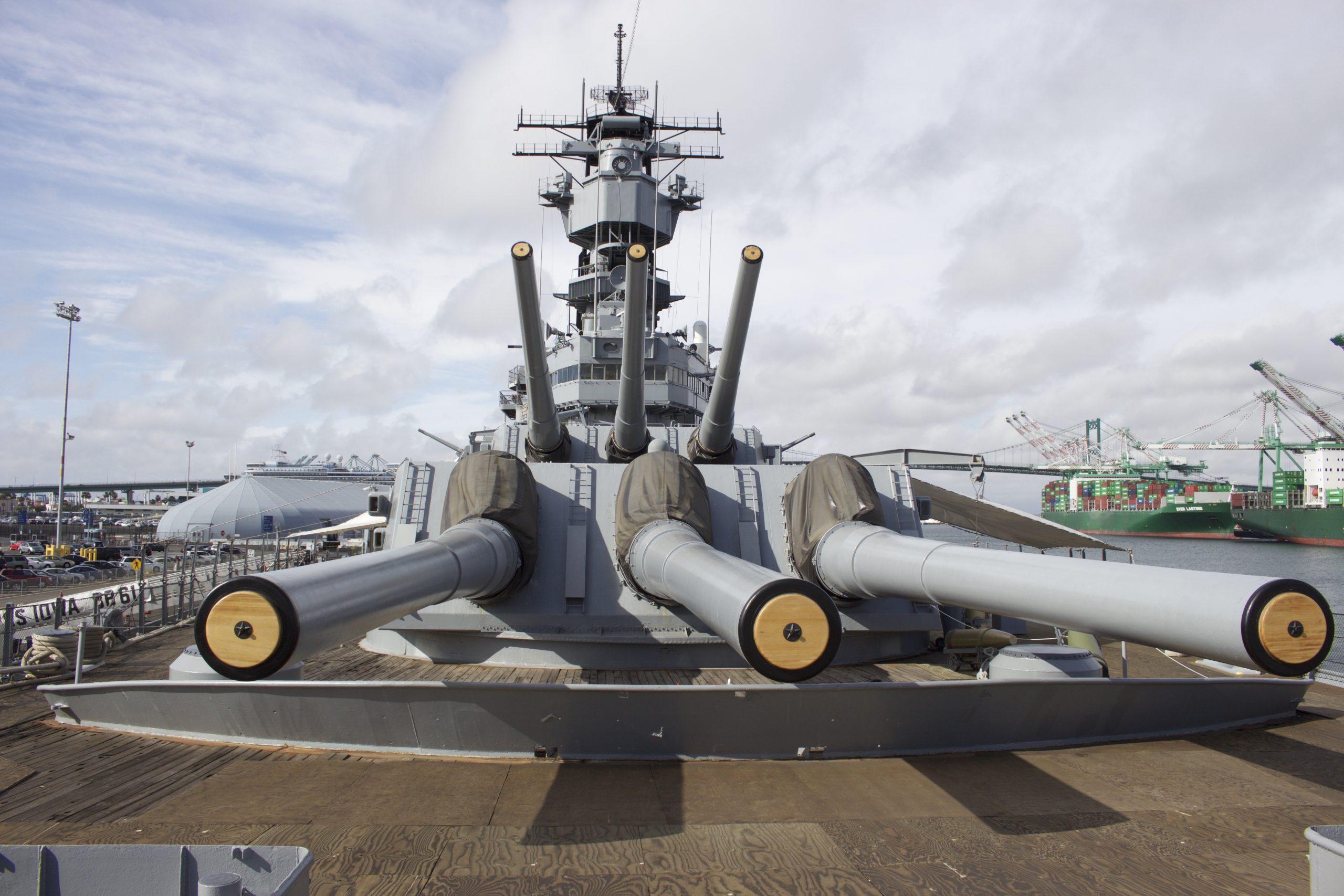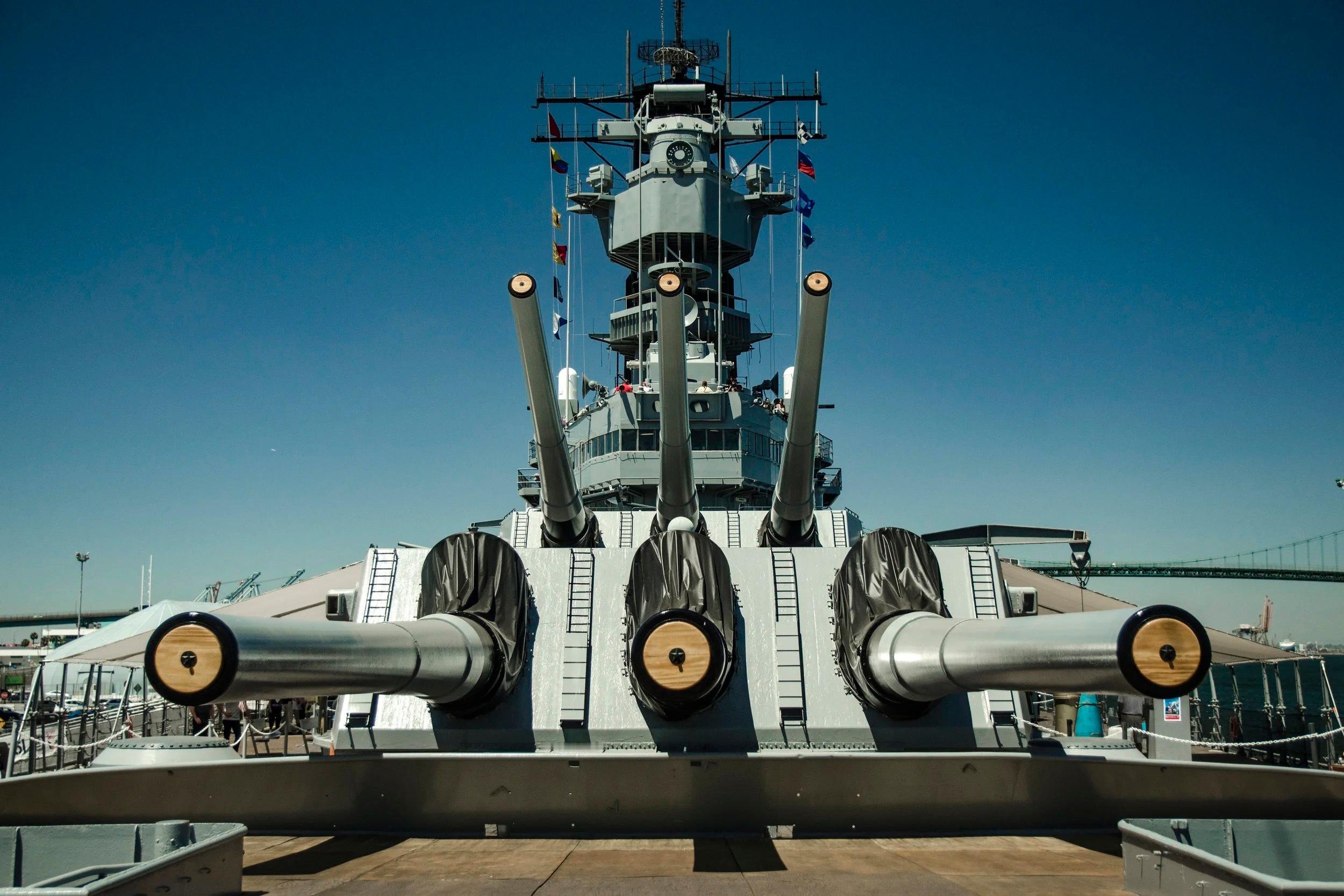 爱荷华级战列舰前部主炮塔的惊人规模,它容纳了三门16英寸(406毫米)主炮。