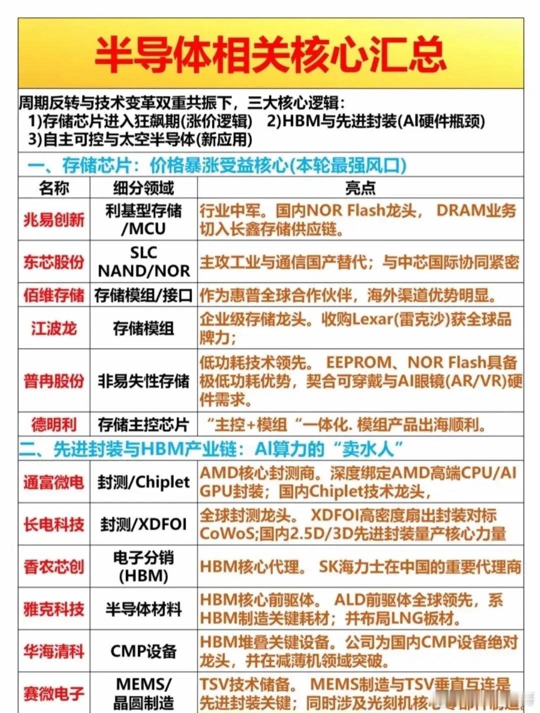 从存储芯片涨价潮到HBM与先进封装的算力革命,再到国产替代攻坚与商业航天新机遇,这份清单帮你快速看懂产业链上的核心玩家与技术亮点。