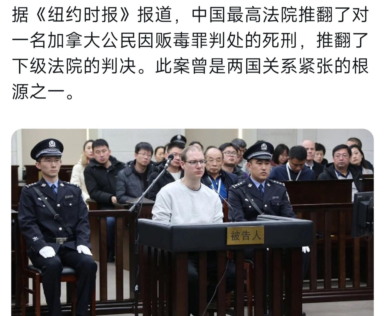 最高院: 撤销对加拿大贩毒者的死刑判决。 有评论指出,这是两国关系正常化的表现