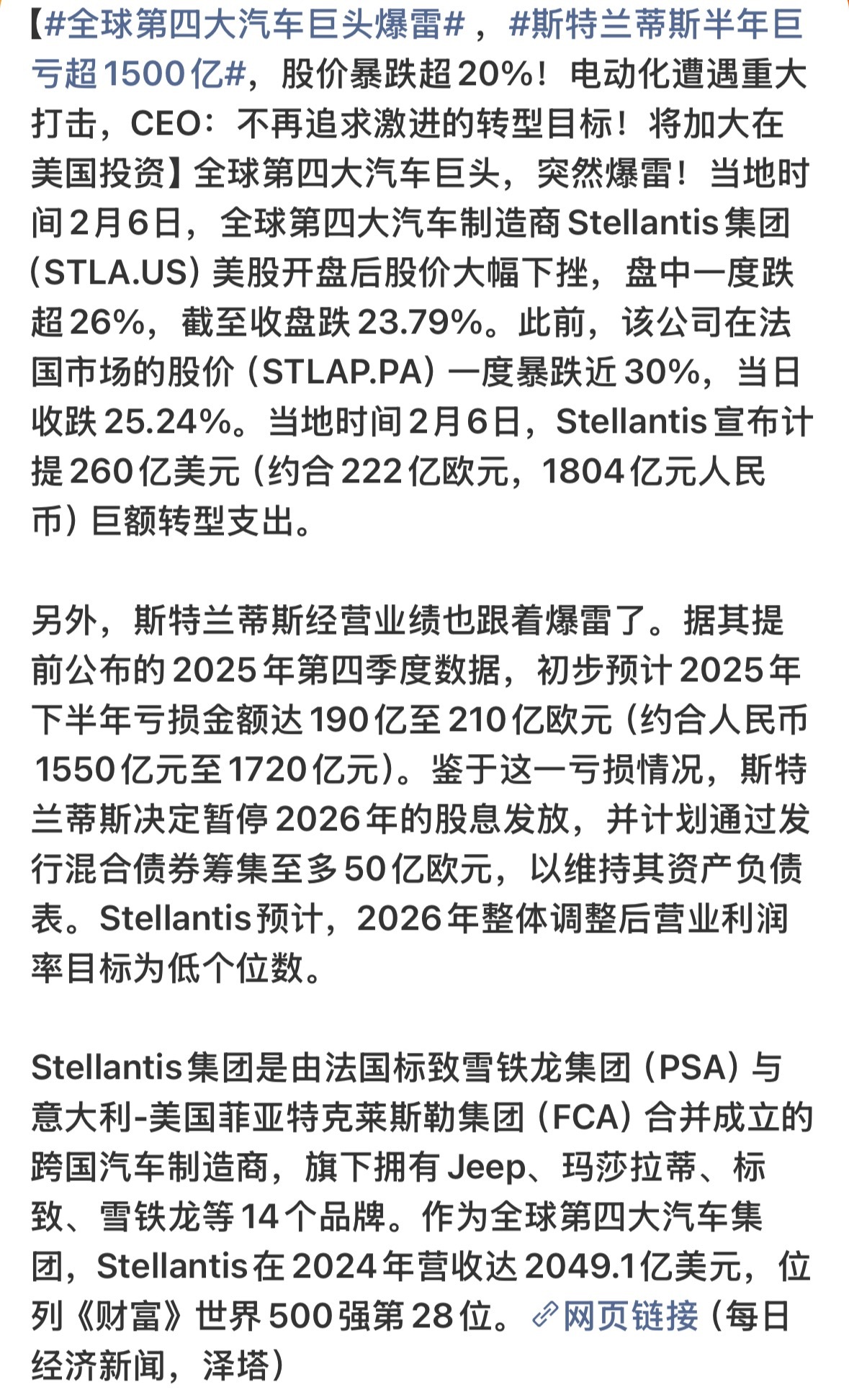 全球第四大汽车巨头爆雷 ,斯特兰蒂斯半年巨亏超1500亿
