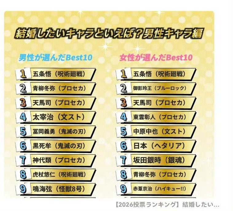 “最想结婚的二次元男角色”投票结果公开,恭喜五条悟获得第一名🥇五条悟最想嫁的动漫角色TOP1