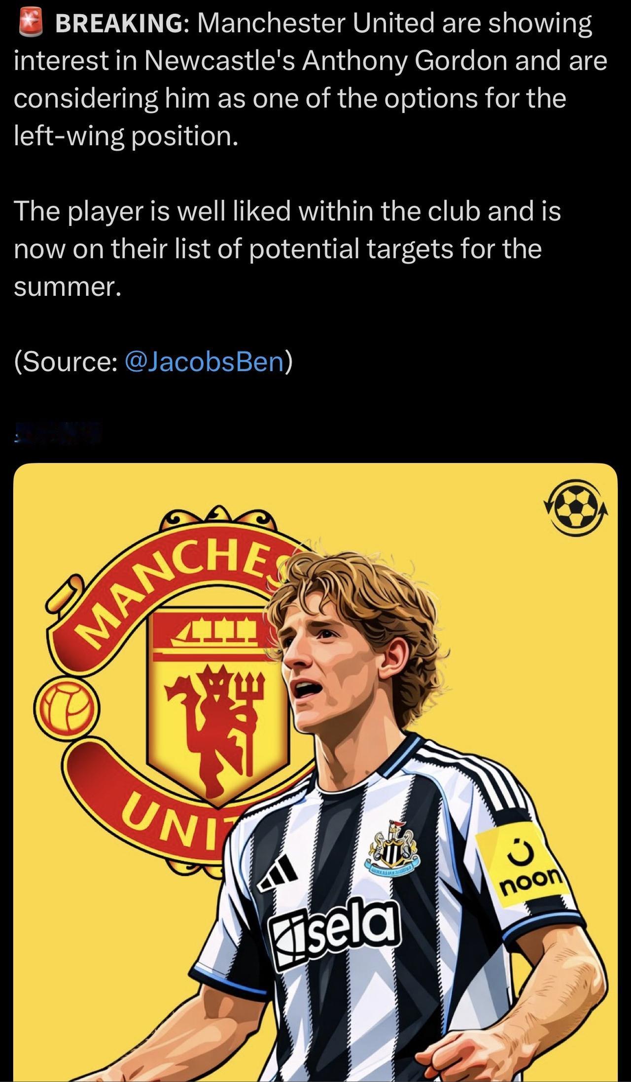 说实话,戈登挺好。 但他更适合纽卡这种打手球队,我大曼联还是来些踢球飘逸一点的[呲牙] ……………………………………………………………… 曼联对纽卡斯尔的安东尼·戈登表现出了兴趣,并正在考虑让他担任左边锋位置。 这名球员在俱乐部内部很受欢迎,目前已被列入俱乐部夏季引援目标名单。