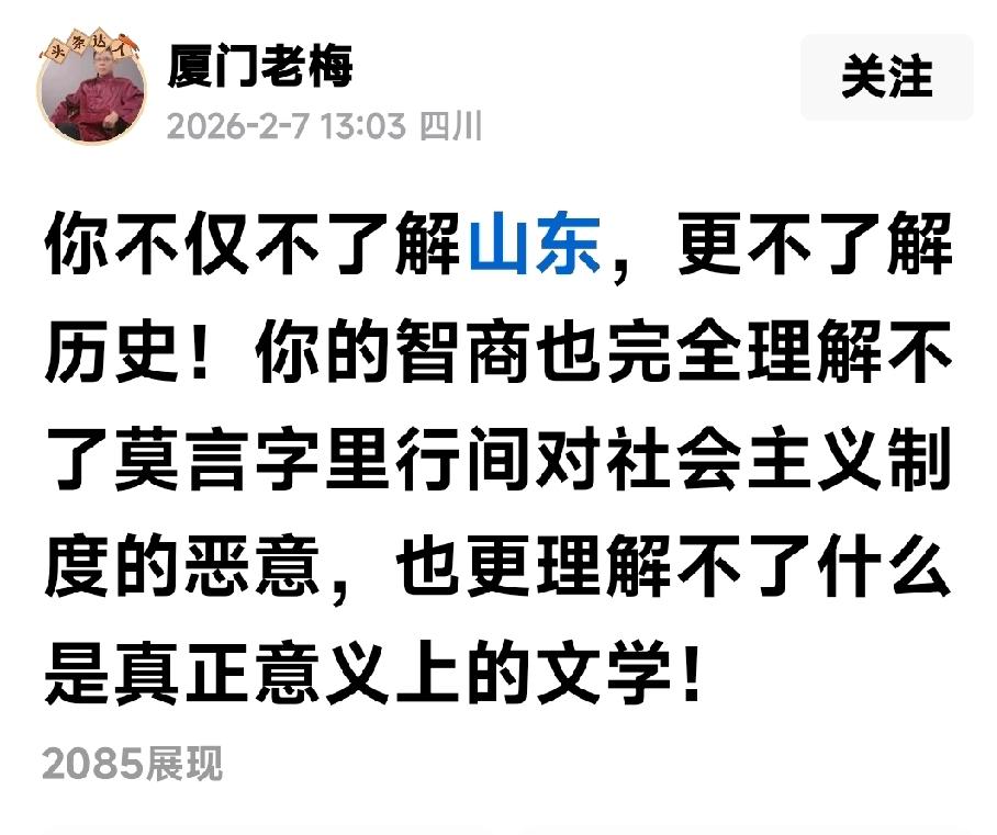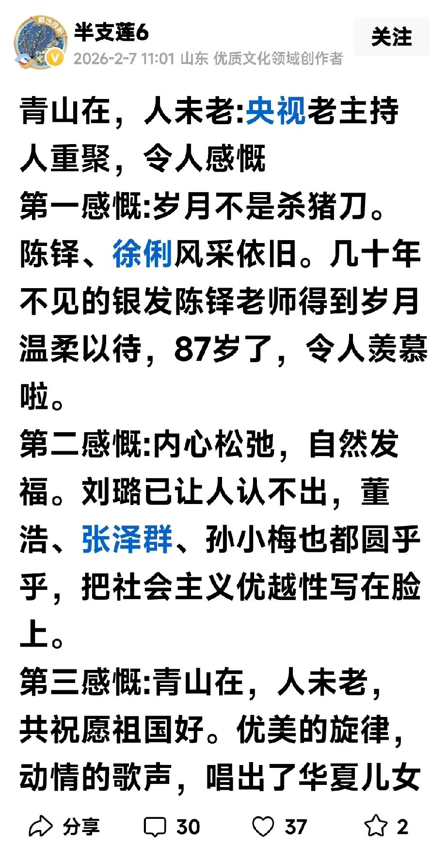 青山在,人未老,半枝莲却不谈莫言了 当2012年山东作家莫言获得诺贝尔文学奖的时候,举国欢庆,这可是中国人第一次获得诺贝尔文学大奖,让占世界人口20%的华人扬眉吐气,大家的心情是可想而知的。 然而,虽然党和国家对莫言先生一直给予高度的评价,莫言当选为国家作协副主席,莫言作品获得国内多个奖项,还应邀出席国庆招待会,但对莫言及其作品的批评批判的声音也一直没有停止。当然,伟人说过凡有人群的地方都有左中右,莫言获得诺贝尔文学奖也是一样,有人或许真正的是站在文学批评的角度,也有人是出于各种不同的目的,也就是别有用心,但好像都成不了气候。 我熟悉的有这么几位:拥有几千万粉丝的大司马,通过批判莫言一下子涨了许多粉丝,收获了巨额的流量,现在已经不知所踪了;还有一个毛星火,湖南山里的农民,小学都没有毕业,然而通过起诉莫言成了网红,现在也已停更偃旗息鼓了;另一个比较著名的就是半枝莲了,几年间发表评论和批判莫言的文章数千篇,情有独钟,篇篇不离谈莫言,正如@公共知识分母 所说,半枝莲的世界里只有莫言! 但不知道从什么时候开始,半枝莲现在也不谈莫言了,前段时间还写文章讨论百岁院士何祚庥,批评国民党主席郑丽文,然而如今意志衰退的速度让人无法想象,可能为了刷存在感,似乎天天就弄一些豆腐干在凑数。 比如在别人的头条下写着一条评论:“不知道你针对谁,但你说的很对[赞][赞][赞]”,也算是一篇作品,其他的还有好几篇,这和以前动辄几千上万字的长文完全不可同日而语了。 最近写的比较长的一篇应该就是感叹央视主人重聚的:《青山在,人未老:央视老主持人重聚,令人感慨》,不过我们对半枝莲也同样的很有感慨,被他一直惦记着的莫言先生仍然在写作,然而莫言小10岁左右的@半支莲6 怎么就未老先衰,不思进取了呢,这真的让人太失望啊。 @永远不屈毛星火 @zxw不饮盗泉水 @城市森林之人 @山中老叟 @灿烂生活家9E孙凯