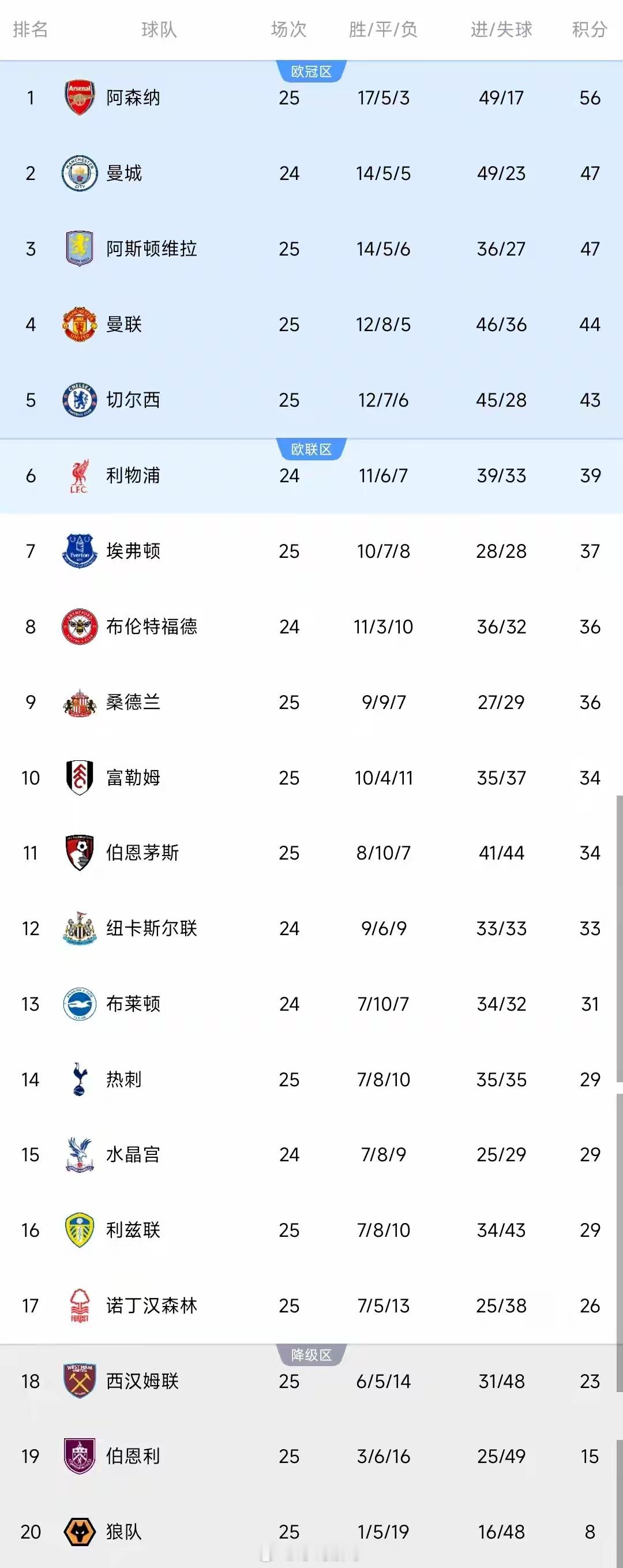 曼联2-0击败热刺豪取四连胜,罗梅罗直红离场后姆伯莫、B费先后建功。切尔西3-1战胜狼队,帕尔默上半场戴帽,蓝军暂列第五,仅落后第四的曼联1分。