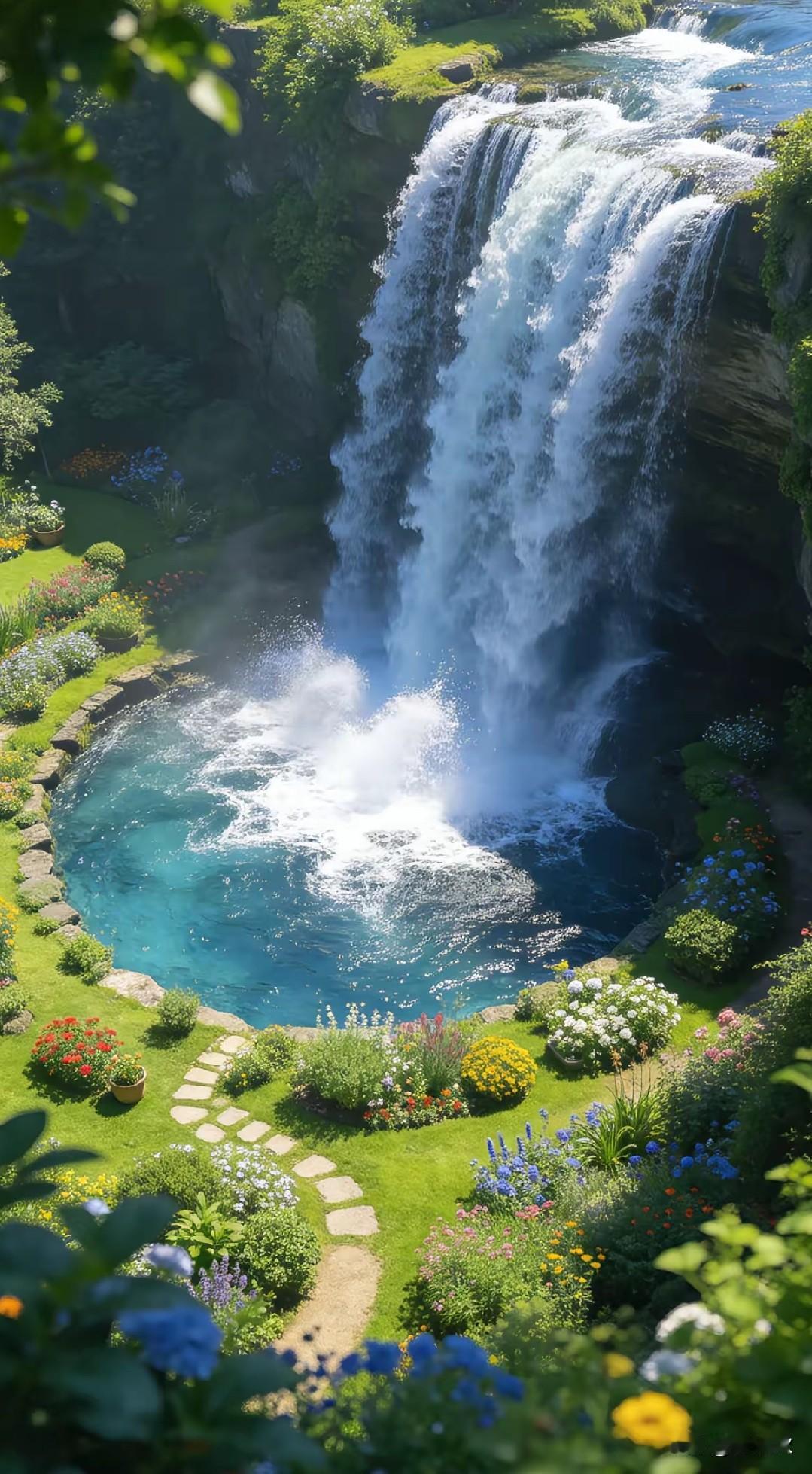 飞瀑崩雷落碧池, 晴光碎玉溅芳枝。 花围曲径春如绣, 文人墨客喜吟诗。