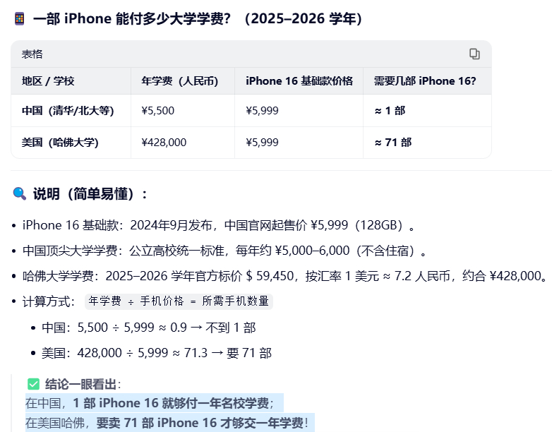 在中国,卖1部iPhone 16就够付一年名校学费;在美国,要卖71部iPhone 16才够交一年学费!