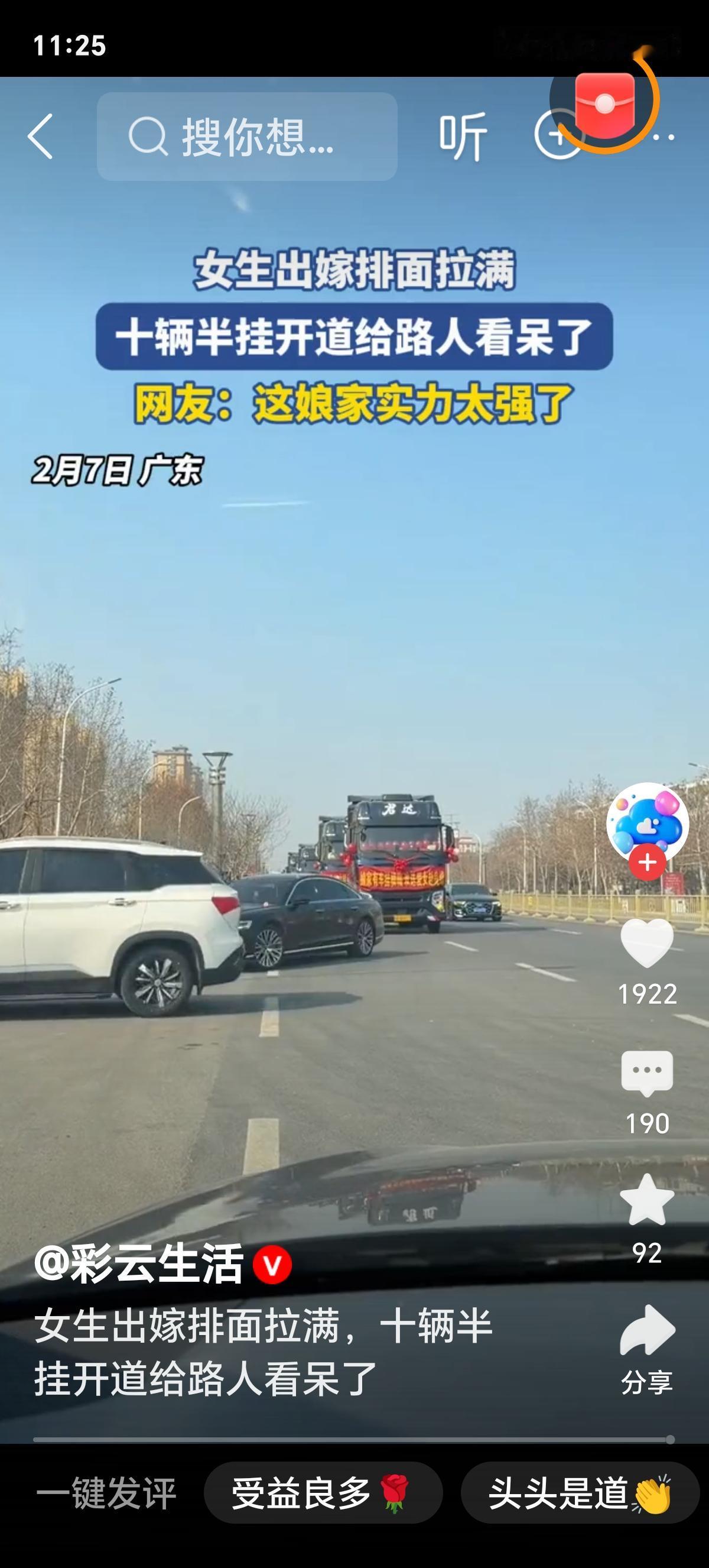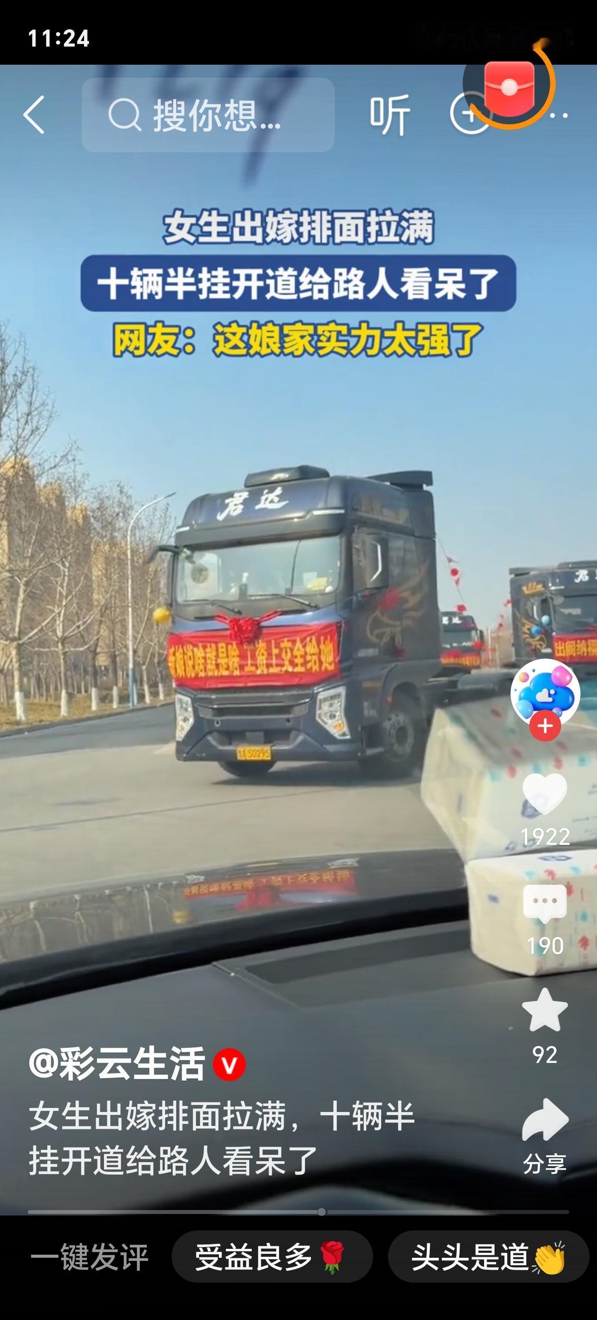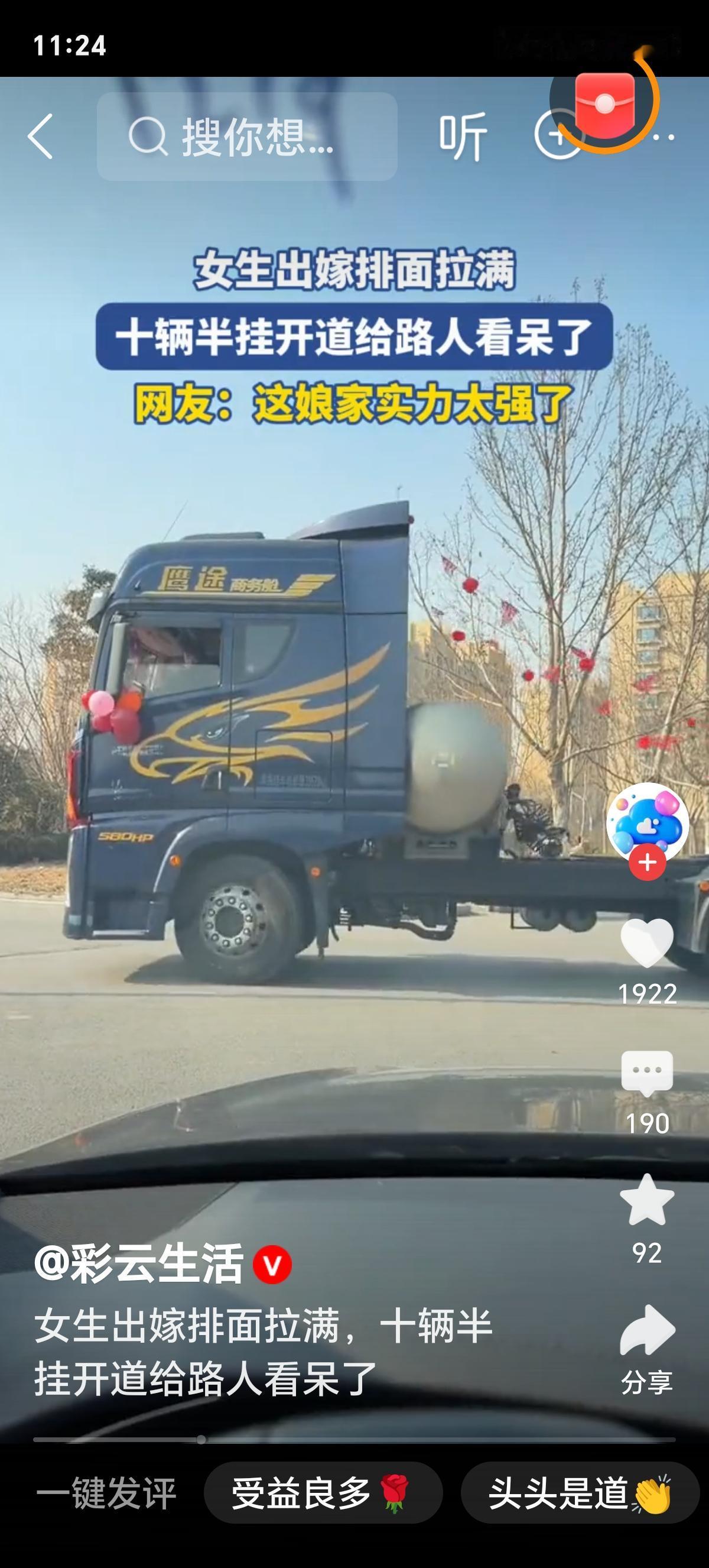 有细节、有纵深、有刺穿感 十辆半挂车停在村口晒场时,像十座移动的祠堂。 红绸在风里翻飞,车头贴着“百年好合”,可真正让我站住脚的,是第七辆车尾—— 一只竹编摇篮用麻绳斜绑在栏杆上,篮沿还系着褪色的蓝布带,带子上歪歪扭扭绣着两个字:“小满”。 那是新娘三岁时,奶奶一针一线缝的。 她没坐豪车,也没走T台。 她踩着一双自己纳的千层底布鞋,鞋面上两朵金线牡丹——左边是母亲教的针法,右边是她婚后第一次回娘家,连夜补上的。 上车前,她把一包炒米糖塞进伴娘手里:“分给村小学的孩子,别让他们等我回来再发喜糖。” 这哪是“排面”? 这是两代人用半生笨拙攒下的郑重,在今天,轻轻托起一个女孩转身的弧度。 我们总说“嫁妆攀比”,却没人算过一笔账: ✅ 十辆车租金3.2万元=父亲连续117个凌晨装卸水泥的工钱; ✅ 车队绕村三圈=全村68位70岁以上老人,第一次坐上空调大巴,去镇上拍人生第一张彩色全家福; ✅ 最后一辆车装的不是家电,是12袋新收的稻谷、8筐自种蜜橘、3床手织棉被——标签上写着:“给新家添点地气”。 最戳心的是啥? 是车队出发前,新郎蹲在车轮旁,用砂纸一点点磨掉锈迹——不是为好看,是怕颠簸时刮伤箱子里那台老式收音机,那是他爸临终前,唯一留给他的东西。 而新娘站在车旁,没看镜头,只仰头数了三遍车顶红绸飘动的次数,像在默念一句无声的誓词。 这世上最硬的排面,从来不是金玉满堂,而是: 你把最旧的摇篮擦亮, 把最薄的嫁衣穿挺, 把最重的爱,装进最实在的车厢里, 然后,不声不响,开向未来。 所谓“拉满”,不是给外人看的热闹, 是给至亲人的交代: **我出嫁了,但没丢根;我奔向新家,却把老屋的砖瓦、灶火、月光,一并搬进了新门。** 评论区预埋话题:“你见过最动人的‘排面’,是什么样子?”二桥半挂车 半挂车方队