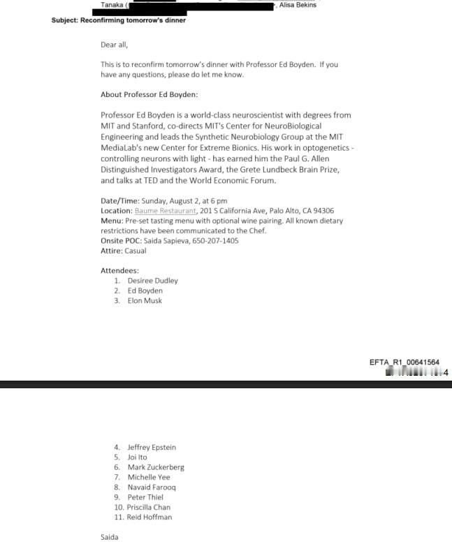 出席者完整名单:— 德西蕾·达德利— 埃德·博伊登— 埃隆·马斯克— 杰弗里·爱泼斯坦— 乔伊·伊托— 马克·扎克伯格— 米歇尔·叶— 纳瓦伊德·法鲁克— 彼得·泰尔— 普里西拉·陈— 里德·霍夫曼