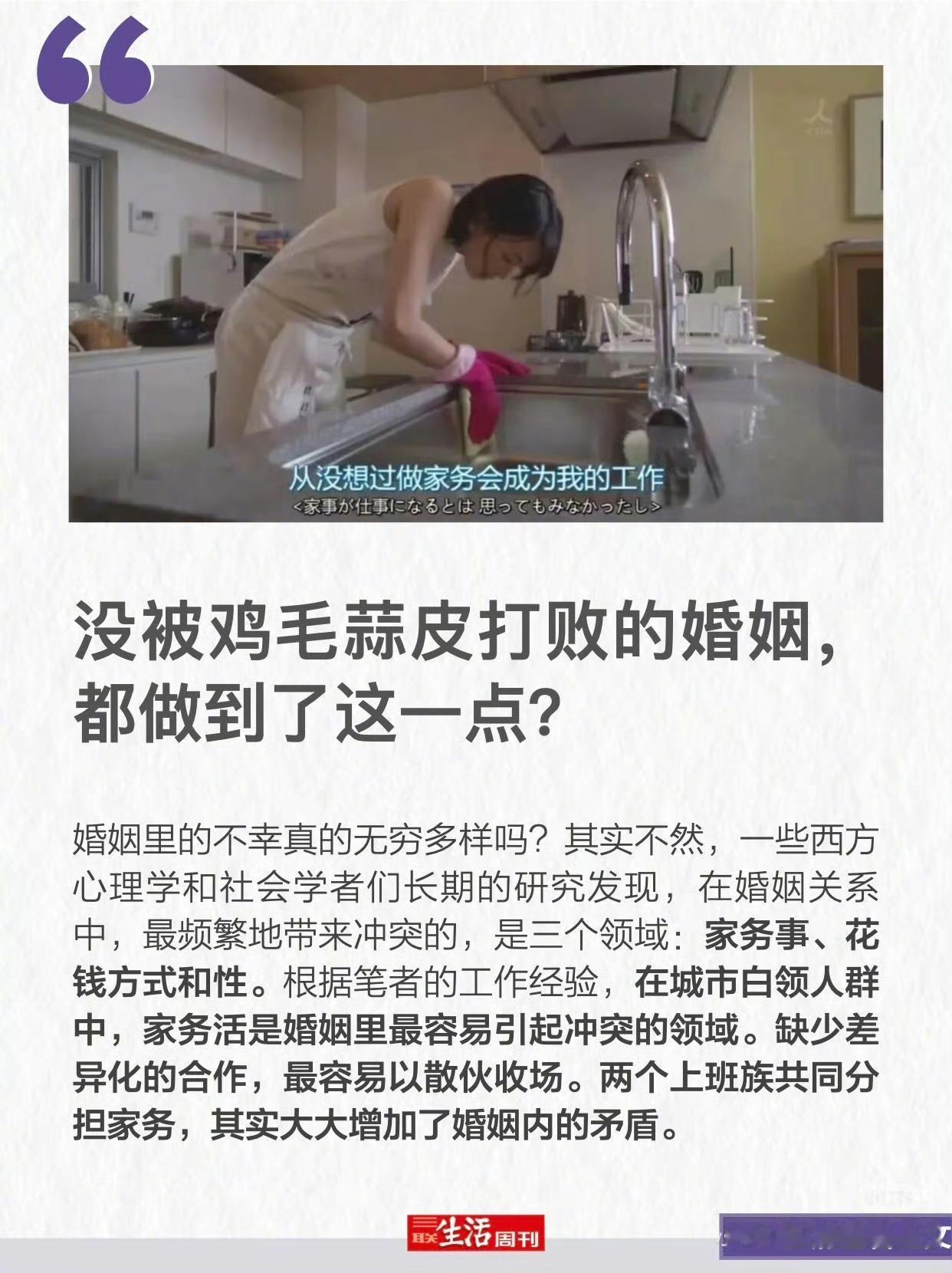 在不少夫妻的婚姻生活里,家务分配就像一颗隐藏的“小炸弹”,处理不好,随时可能引发争吵,影响夫妻感情,可要是分配得当,它又能成为婚姻长久的润滑剂,让日子过得和和美美。 很多夫妻刚结婚时,对家务分配没啥概念,觉得谁有空谁做就行,但日子一长,问题就冒出来了,就说我的朋友小李和他妻子吧,刚结婚那会儿,小李觉得妻子上班辛苦,主动承担了大部分家务,扫地、拖地、洗碗,啥都干,妻子呢,一开始挺感激,可时间久了,就慢慢习惯了,觉得这些活本来就该小李做,有一次小李工作特别忙,加班到很晚才回家,累得腰酸背痛,看到家里还是乱糟糟的,碗也没洗,他一下子就火了,冲着妻子抱怨起来,妻子觉得自己也没闲着,上班也很累,两人就这么你一言我一语地吵了起来,原本温馨的小家瞬间充满了火药味。 其实啊,家务分配不均,往往是因为夫妻双方没有明确各自的职责,缺乏沟通和理解,要是总让一方承担大部分家务,时间长了,承担的那一方难免会觉得委屈和疲惫,而不承担的那一方则可能变得理所当然,不懂得珍惜对方的付出。 那怎么分配家务才能让婚姻长久呢?首先,夫妻双方得坐下来好好商量,根据各自的时间、能力和兴趣来分配家务,比如,小李妻子比较擅长做饭,那她就可以负责家里的三餐,小李力气大,像搬重物、修理家具这些活就由他来干,扫地、拖地这种日常家务,两人可以轮流做,或者一起做,这样既能减轻负担,又能增进感情。 除了明确分工,夫妻之间还得互相体谅和包容,有时候一方可能因为工作忙或者其他原因,没按时完成自己负责的家务,这时候另一方别急着指责,而是要关心对方是不是遇到了什么困难,主动帮忙分担就像有一次小李妻子单位临时加班,回家很晚,没来得及洗衣服,小李看到后,不仅没有抱怨,还主动把衣服洗了。妻子回来后特别感动,两人之间的感情也更深厚了。 另外,偶尔来点小惊喜也很重要,一方在完成自己家务的基础上,主动帮对方做一件他平时不太愿意做的家务,像给对方擦擦皮鞋、整理一下书桌啥的,这些小小的举动,能让对方感受到自己的爱和关心,让婚姻生活充满温馨和甜蜜。 婚姻就像一场漫长的旅程,家务分配只是其中的一个小环节,只要夫妻双方用心经营,相互理解、相互支持,合理分配家务,就能让婚姻这艘小船在生活的海洋里平稳前行,长久地驶向幸福的彼岸。 夫妻间怎么分配家务才能婚姻长久 婚姻 事件来源:三联生活周刊