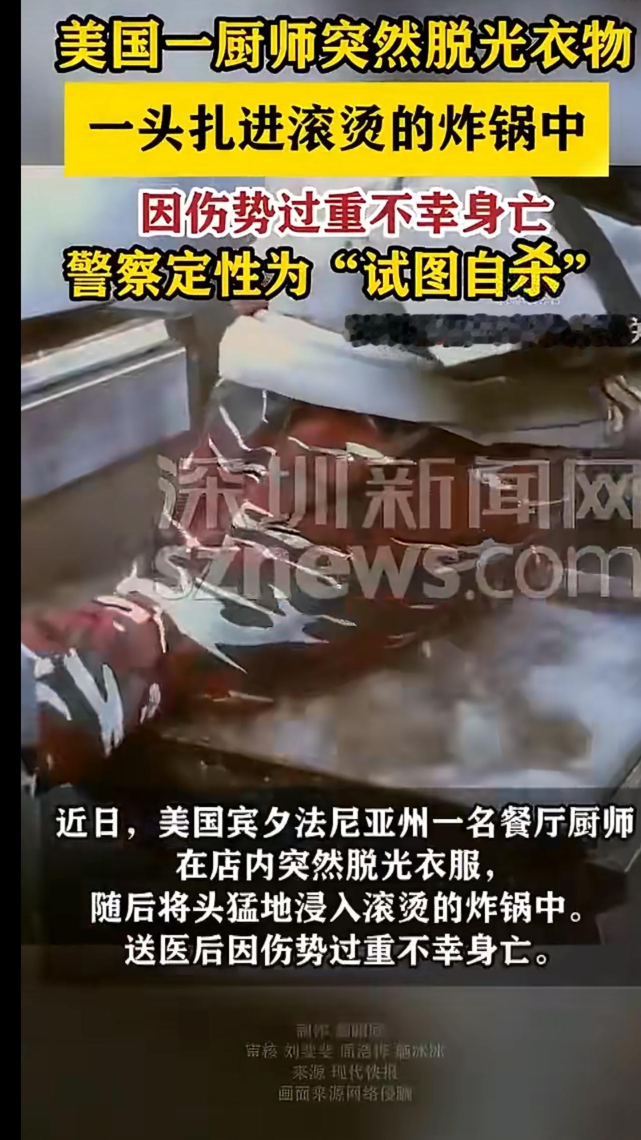 美国发生了一起让人痛心又震惊的自杀事件,主角是一名餐厅厨师,他竟然在工作时脱光衣服,把头扎进了滚烫的炸锅里,最终因伤势过重不幸身亡。 这起悲剧发生在美国宾夕法尼亚州的一家餐厅厨房内,据目击者描述,当天下午,这名厨师突然做出了令人难以置信的举动,他先是脱去了自己所有的衣服,然后毫不犹豫地将头猛地扎进了炸锅中,炸锅里的油温极高,厨师瞬间就被严重烧伤,情况十分危急,同事们看到这一幕,都被吓得惊慌失措,但很快反应过来,纷纷冲上前去试图阻止这场悲剧,有人试图将厨师从炸锅里拉出来,有人则赶紧拨打急救电话,在混乱中,一名女员工不幸被热油溅到,受了轻伤,但她顾不上自己,仍然坚持参与救援。除了同事,当时在餐厅里用餐的顾客也目睹了这惨烈的一幕,至少有一名顾客勇敢地站了出来,试图帮助厨师脱离险境,然而,尽管大家拼尽全力,厨师的伤势还是太重了,他被紧急送往附近的医院进行救治,但医生们经过全力抢救,最终还是没能挽回他的生命。 这起事件发生后,餐厅立刻陷入了混乱和悲痛之中,为了处理后续事宜,餐厅不得不关闭了数天,员工们心情沉重,他们不仅失去了一个同事,更亲眼见证了生命的脆弱和无常,而那名在救援中受伤的女员工,虽然伤势不重,但心理上的创伤却难以抚平,警方在接到报警后迅速赶到了现场,并展开了调查,经过初步了解,警方将这起事件定性为自杀未遂,但出于对厨师及其家属的尊重,他们并没有公开厨师的个人身份信息。 这起悲剧让所有人都感到无比痛心和惋惜。生命是宝贵的,无论遇到什么困难和挫折,都不应该轻易放弃,而这名厨师的极端行为,不仅让自己失去了生命,也给家人、同事和餐厅带来了巨大的伤痛和损失,这起事件也提醒我们,要关注身边人的心理健康问题,在现代社会,生活节奏快、压力大,很多人可能会因为各种原因产生心理问题,如果我们能够及时发现并给予帮助和支持,或许就能避免类似的悲剧再次发生。美国一厨师脱光扎进炸锅中身亡 打工人 事件来源:新浪新闻