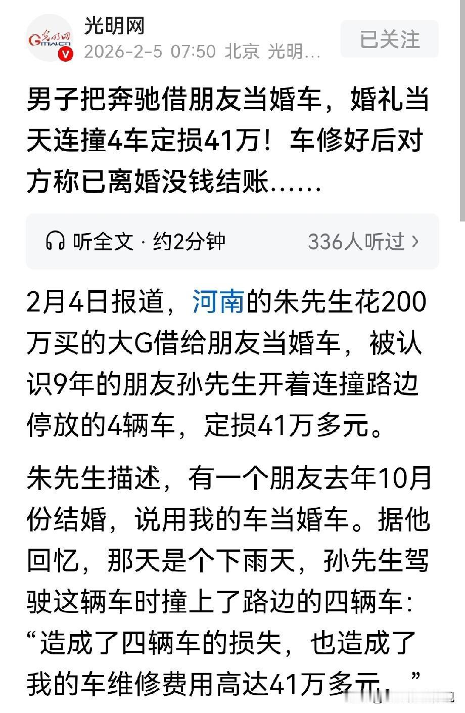车子不能外借!河南,男子刚买了半年的200多万奔驰大G,被认识9年的朋友借去当婚车。不料当天连撞4车,奔驰面目全非,定损维修费高达41万多。男子看在朋友的面子,同意拆件维修省一半钱。不料,车子修好,朋友称已离婚,净身出户没钱结账…… 朱先生怎么也没想到,自己花200万买的奔驰大G,才开了半年就因借给朋友当婚车,惹出了一场大麻烦! 朱先生这人重情义,朋友来开口借车当婚车,他二话没说就答应了。 婚礼那天,他的另一个朋友孙先生驾驶他的那辆奔驰。 谁能想到,孙先生开着车,一下子就连撞了路边停着的4辆车。 乘车的新娘事后回忆称,当时孙某一踩油门,车直接飞出去了! 大喜之日,却碰上这么不靠谱的司机,车祸还差点毁了当天的婚礼。 车速特别快,喜家车队跟车的说,他们开100码都追不上他。 等新娘等人反应过来时,已经连撞了好几辆车。 而开这辆车的孙先生称,,当时路况不好,自己也没有做好准备。 开车就有点大意了,车速提速起来,想刹车的时候根本刹不住了。 事故发生后,交警给出事故认定书,驾驶人孙先生负主要责任。 看着认定书,朱先生心里那叫一个憋屈,自己好好的车,就这么被撞得面目全非,定损下来要41万多元呢。 修车的时候,朱先生考虑到和孙先生也是9年的朋友了,不想把关系闹得太僵。 就同意了用拆车件来维修,能省一半的费用。 朱先生觉得,这样也算是给朋友减轻点负担。 结果车修好了,对方却装作不知道,迟迟不去结账取车。 朱先生接到通知,车已修好了,他以为孙先生能赶紧去结账取车,把这事儿了结了。 可左等右等,孙先生就是没动静。 朱先生忍不住给孙先生打电话,电话那头孙先生支支吾吾。 最后竟然说,自己和妻子离婚了,还是净身出户,手里没钱。 朱先生一听就愣住了,怎么说离婚就离婚了? 而且他还有辆坦克500,写的是他妻子的名字,可为啥偏偏这会离婚? 朱先生越想越觉得不对劲,就去找孙先生当面问个清楚。 见到朋友,他直接就说,车修好了,你得去结账啊。 孙先生一脸无奈,说真不是不想给,是真没钱了。 孙先生称他和老婆离婚了,自己净身出户。 朱先生又问他,那辆坦克500呢? 你夫妻俩恐怕是‘假离婚’躲债吧! 修好的车还在4s店趴着没人拿钱。 而朋友的一些操作,让朱先生无法理解,他去找了结婚的主家开了证明。 注明自己当天是“义务帮工没有工钱,还去调了监控,就是想找理由分担一些责任。 为此双方各执一词,孙先生称,开证明只是想证明自己没获利。 调取监控,是想看明白事故当时的完整情况。 朱先生因为拖欠车子的维修费,车也取不出来,无奈,只好将好友告上法庭,两人最终对簿公堂。 有人认为,难道车主豪车买得起,没买保险吗?为啥不走保险,让朋友赔保费上涨部分加折旧。 9年的朋友,还让人一下掏几十万,多大的仇啊? 如果没买商业险,提前说明清楚,最好别借车出去。 有人认为,借车的二五零千万别深交,公事场合别让他掺和。 出风头显能耐的,就是这类货色,开别人的豪车一下就摸不着北,找不着调,只知腾云驾雾。 出问题了爱咋地咋地,撒手甩锅与他无关了,这哪是朋友,妥妥的损友啊。 借车人超速操作不当才酿大祸,事后还疑似假离婚逃债。 既毁婚礼场面,又伤友情,所以豪车借人风险高,人情与法律边界必须划清。 目前,孙先生表示,两人之前还有合作生意,交情很深。 只是自己当时拿不出钱来,但可以用店面物品折钱,不够再补,从来没想逃避或推脱责任。 既然朋友已经告到法院,那就等法院判决结果吧,判多少,赔多少。 根据《民法典》第1209条: 因租赁、借用等情形机动车所有人、管理人与使用人不是同一人时,发生交通事故造成损害,属于该机动车一方责任的,由机动车使用人承担赔偿责任; 机动车所有人、管理人对损害的发生有过错的,承担相应的赔偿责任。 孙先生因超速、操作不当负主要责任。 即使他与车主是朋友关系,只要其驾驶行为存在过错,就需对事故后果负责。 若朱先生无过错,如车辆无缺陷、孙先生有合法驾照、车辆已投保交强险等,则无需承担赔偿责任。 若车辆未投保交强险,车主朱先生需在交强险限额内,与孙先生共同承担赔偿责任。 若孙先生通过净身出户,将财产转移至妻子名下,以逃避债务,朱先生可请求法院,撤销该财产转移行为。 即使孙先生离婚,法院仍可执行其个人财产。 若其确实无力偿还,可能需分期履行债务。 本案中,孙先生作为驾驶人,应承担主要赔偿责任。 朱先生若无过错,则无需担责。 但需注意,未投保交强险,或管理疏漏,可能导致车主连带赔偿。 法律保护善意车主,但情谊行为(如免费借车)无法免除驾驶人的法定责任。 普通人借车时,应谨慎评估风险,避免因人情陷入法律纠纷。 对此,你怎么看? 关注@赵哥的法律观