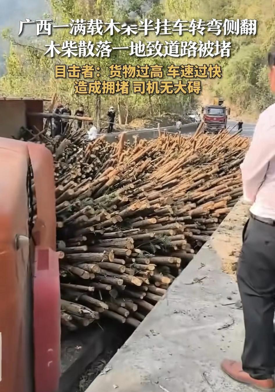 广西百色的一位车主称行驶在路上,前面一辆半挂车满载木材,车速较快,转弯过程中,挂车倾翻了,木材也倒了一地,幸亏是旁边没有行人和车辆经过,司机没有受伤,不过造成了一路的小车拥堵,像这样的情况,很有可能就是超载了,司机的行车也不规范,临近春节,大家出门在外一定要注意交通安全。