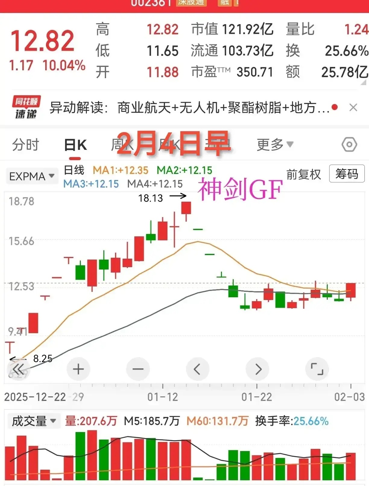话说位置高低,让我想到神剑股份,此股我在2月4日早上贴图的时候,是一个涨停板。2月5日,是一个阴线十字星,全天任何交易时间里,都可以从容上车,我也言行一致,从从容容不慌不忙地踏实起飞的客机。这里我想说的并不是我多么会买,多么有水平,要说的就是关于这个位置问题。此股前面高位下跌,连续五天大跌,跌幅巨大,然后横盘了十来天,此处既有可能反弹也有可能破位,经过分析,我觉得上涨的概率稍大,买入后如果出现不符合预期的话,万一跌破涨停板底部,就得认赔离场。谁也不能保证买入的票,百分百是上涨的,做好预案心不慌。横盘的位置,对比前面高点,显然不是人们口中的高位,如果对比前面起涨点,那当然是高位,所以,位置高低并不是绝对化的,只是相比较而言。如何衡量,不能仅看左侧,还应该想象右侧,未来会是什么样子,有什么逻辑。