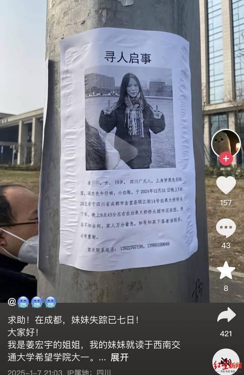 截至2026年2月8日,成都一女大学生已失联超20天,警方已全面介入调查,目前尚未公布最新进展。社会各界持续关注,呼吁知情者提供线索,愿失踪女孩早日平安归来,具体信息以官方通报为准。失联大学生 00后失联女孩