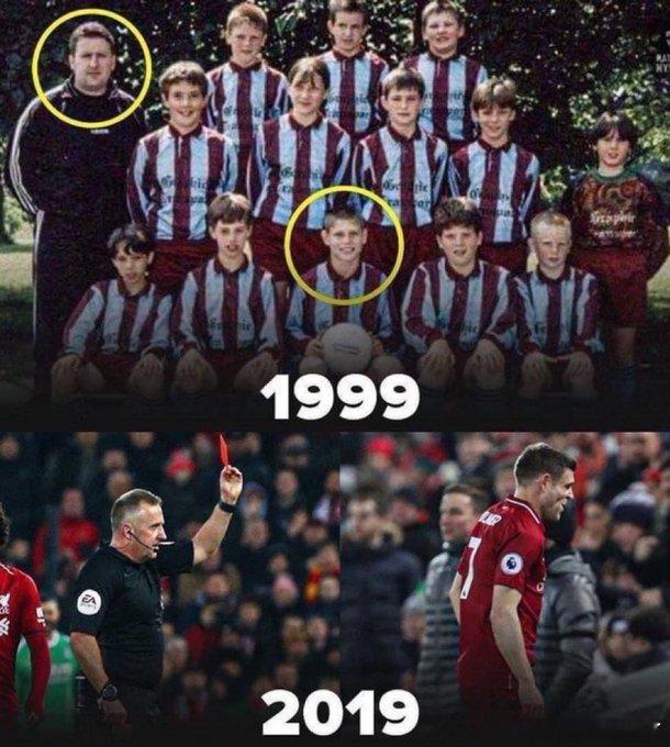 2019 年:时隔 20 年,米尔纳在利物浦 4-3 战胜水晶宫的比赛中被他的前小学老师乔纳森·莫斯罚下场。
