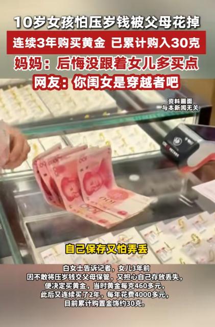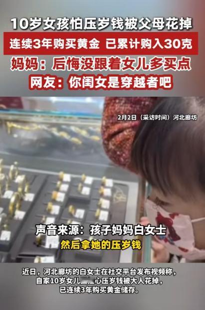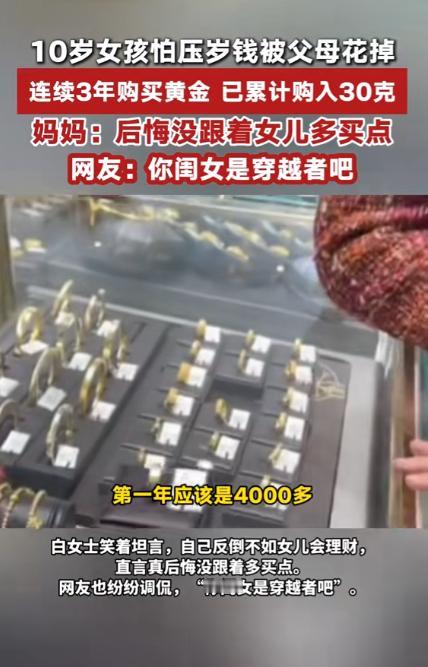 太有头脑了!河北,10岁女孩怕自己的压岁钱被父母花掉,又怕自己弄丢,便决定买黄金,3年来,她一共购入了30克黄金,最便宜的时候以460的克价购入。妈妈知道后,调侃自己不如女儿会理财!网友:年轻脑子就是好使! 最近全网都被河北一个10岁小姑娘的理财操作狠狠圈粉了,别的孩子收了压岁钱不是随手造了就是被爸妈一句“帮你存着”收走代管。 这姑娘倒好,愣是凭着自己的小主意,三年时间把压岁钱换成了实打实的足金,整整攒下30克。 这姑娘的黄金存钱计划,从 8 岁那年就开始了,那年春节,她第一次攒下四千多块压岁钱,攥着红彤彤的红包,心里却犯了愁。 课间和同学聊天,她听着小伙伴们吐槽各自压岁钱的 “悲惨命运”,有的被爸妈拿去交了补习班学费,有的被用来给弟弟买了玩具,还有的被代管后就再没了音讯,这让她打定主意,一定要把自己的压岁钱守好。 她琢磨来想去,现金藏在卧室怕弄丢,交给爸妈又担心被花掉,偶然和妈妈逛商场时,金店店员一句 “黄金是硬通货,放多久都不会坏,还能保值”,让她瞬间锁定了目标,当下就拉着妈妈的手说,要把压岁钱都拿来买黄金。 妈妈一开始只当孩子是闹新鲜,还打趣她是不是想当小富婆,可架不住姑娘态度坚定,还掰着小手跟妈妈念叨,黄金看得见摸得着,摔了砸了还是金子,比纸币靠谱多了。 最终妈妈拗不过她,陪着她走进了金店,赶上当时金价 460 元 / 克的低价,姑娘花光了所有压岁钱,挑了一枚 5 克的足金生肖吊坠。 谁也没想到,这次看似心血来潮的购买,成了姑娘每年春节的固定操作。第二年春节,她再一次拿到四千多压岁钱,没有丝毫犹豫,拉着妈妈直奔金店。 这次她却没再选好看的金饰,而是指着柜台里的投资金条说要买这个,还跟妈妈解释,店员说金条纯度更高,没有多余的工艺费,溢价低,比金饰更划算,存放也方便。 妈妈这才发现,女儿不是一时兴起,而是真的有自己的小考量。 到了第三年春节,小姑娘的压岁钱攒了五千出头,这次她的选择又变了,盯上了一款 15 克的古法足金手链。 理由也特实在,金条只能藏着掖着,啥用都没有,手链既能戴在手上装点,日常出门能戴,又能当作黄金资产保值,一举两得。 姑娘的这些操作,妈妈一直看在眼里,却没太在意金价的变化,直到今年春节后,她闲来无事翻出三年来的购买票据,又查了查当下的金价,一算账才惊住了。 女儿攒下的 30 克黄金,如今市值涨了快一半,比自己存了八年的定期收益高多了,妈妈平时也喜欢琢磨理财,选理财产品时总纠结来纠结去,没想到最后竟被自家 10 岁的女儿比了下去。 她忍不住跟身边人调侃,自己活了几十年,理财能力还不如一个孩子,更后悔当初没跟着女儿多买点。 不然现在也能跟着赚上一笔,笑着说自家闺女这脑子,怕是从未来穿越过来的,不然怎么小小年纪,就这么会规划。 妈妈把女儿的这段理财经历发到了社交平台,没想到一下子就火了,单条视频的播放量很快破了千万,网友们都被这个小姑娘的理性和坚持折服了,评论区里炸开了锅。 有人说现在的孩子太厉害了,小小年纪就懂资产保值,这财商比不少成年人都强,还有人晒出自家孩子的压岁钱花销,调侃自家娃的红包转眼就花在奥特曼卡片、零食上了。 人家娃都已经开始默默攒黄金了,还有的网友开玩笑说,要赶紧把自家孩子的压岁钱收过来,跟着这位小理财家学几招,也去买点黄金存着。 更有意思的是,这姑娘对自己的 “黄金小金库” 管理得格外用心。 她专门找了一个小笔记本,工工整整地记下每次购买的时间、克重、金价和花费,偶尔还会让妈妈帮忙打开手机,看看当天的金价走势,虽然似懂非懂,却看得格外认真。 有人问她要不要把黄金卖掉赚一笔,她却摇摇头说,现在卖了就没了,要一直存着,等以后上大学,或者家里有急用的时候再用,小小年纪,却有着超出年龄的沉稳。 这件事在网上传开后,也让不少家长开始思考,孩子的压岁钱到底该怎么管。 很多孩子的压岁钱,要么被家长随意挪用,要么被孩子胡乱花掉,而这个河北小姑娘,却用自己的方式,把压岁钱守得好好的,还实现了保值增值。 这个 10 岁小姑娘的操作,不光成了全网的热门谈资,更给不少家长提了个醒,原来孩子的财商,也能从打理压岁钱开始慢慢培养。 对于这件事,您有什么想说的吗?欢迎评论区留言讨论。 信源:大众新闻·半岛都市报2026-02-03——《10岁女孩怕压岁钱被父母花掉,连续3年购买黄金,已累计购入30克,妈妈:后悔没跟着女儿多买点。》