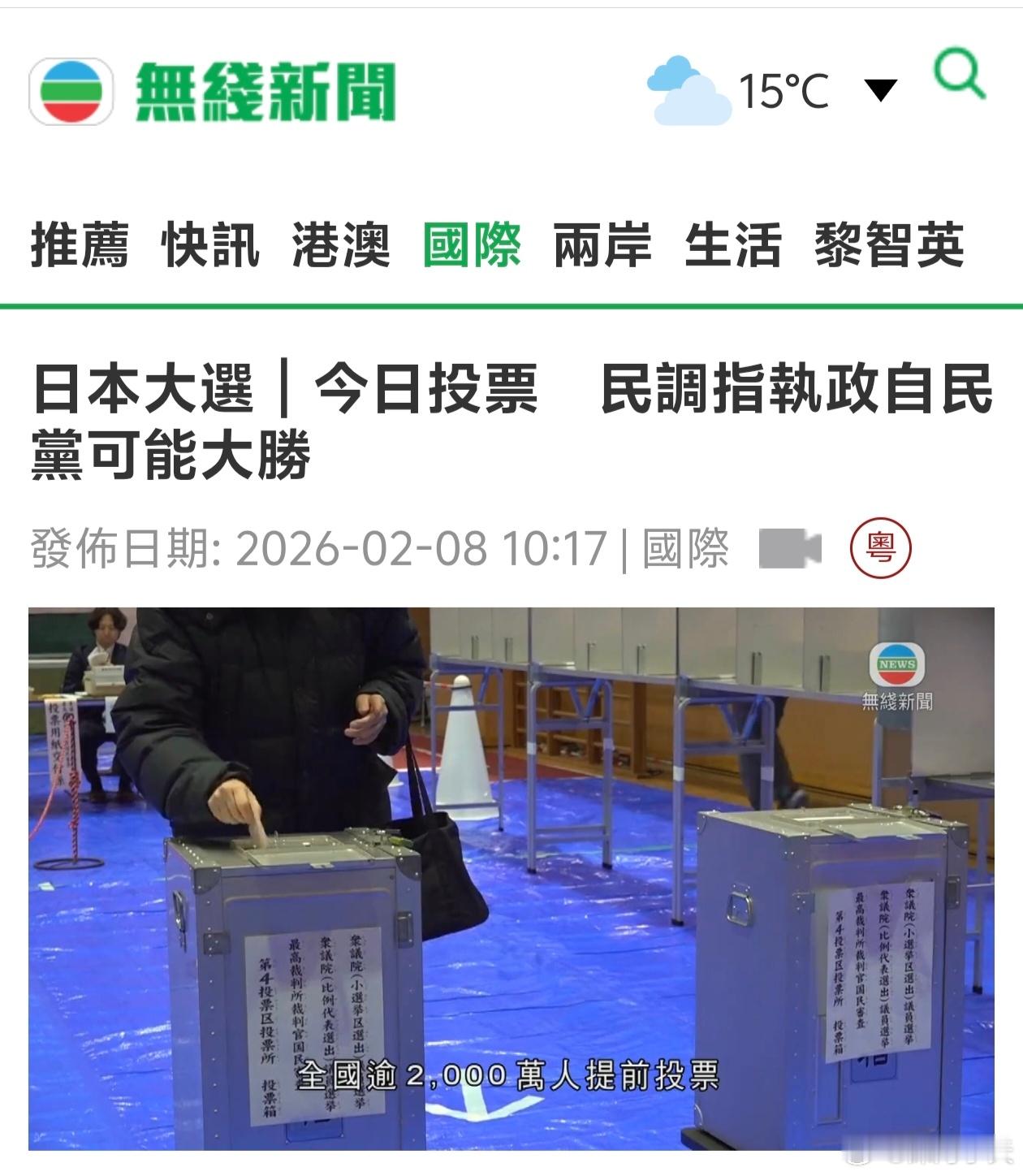 日本今日投票,民调称高市将压倒性胜利日本众议院选举今日投票,最新民调显示,首相高市早苗领导的自民党将取得压倒胜利。东京昨日有示威,反对高市执政。这次众议院选举,全日本有接近1,300名候选人,角逐465个议席。经济是大选焦点议题之一,部分政党倡议缩减消费税,以刺激民众增加消费。总务省指截至周五,全国逾2,000万人提前投票,比上届选举多出约400万人。今次选举被视为选民对首相高市早苗及执政自民党的考验。高市早前发表「台湾有事论」,亦计划增加军费预算。日本物价疯狂上涨日本众议院正式解散