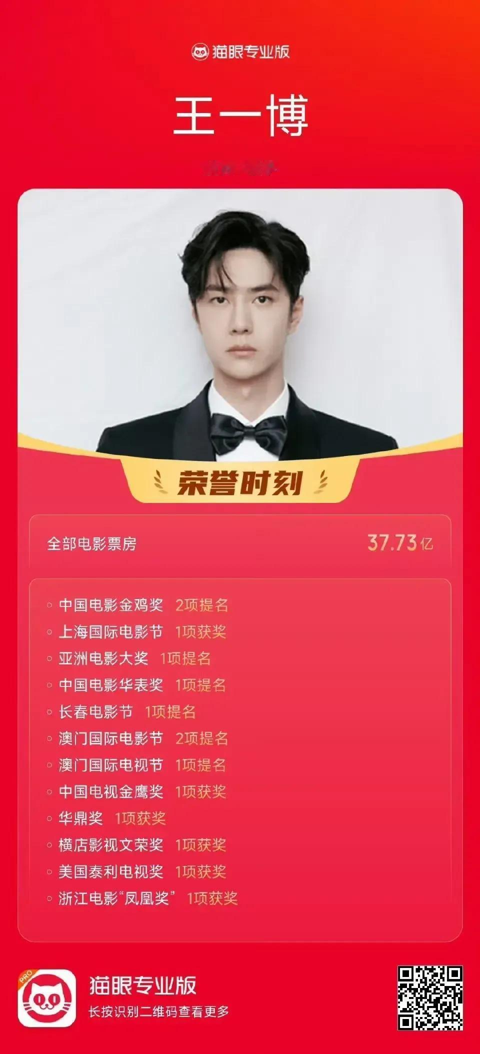 看别人吃瓜贴出的二排演员们的荣誉时刻,不看不知道,一看王一博实绩是最多的!荣誉时刻图都比别人的长一截。 荣誉项目多,影视都有;含金量高,华表提名、金鸡二提、上海国际电影节最受传媒关注男主角获奖等等。 不要忘了他还有电影短片获柏林电影节金熊奖提名。 电视剧有金鹰奖获奖金莲花提名。(白玉兰个人提名被剧方偷了太可恨) 而且手握内娱前所未有的重量级奖项:美国泰利奖金奖🏆。王一博是《探索新境》的发起人,个人能拿到这个纪录片国际最高奖被称为是国内纪录片发展的里程碑。 论电影咖位,他能单扛票房,所有影片全部盈利,三部影片全部是金鸡+华表双提名!影史留名。 论商业价值,他是公认的TOP1,连续六年商务代言数量内娱第一! 论人气和流量,他是毋庸置疑的断层TOP1! 论国际咖位,他在国外活动的座位常常是左一个奥斯卡影帝右一个奥斯卡影后。 也就是他不争渣浪堂会C位这些虚名。有实力在哪儿都是关注焦点。 王一博参加活动不矫情不摆架子,来了就走红毯,走完红毯都不入座,领完奖潇洒走人。就这样热搜都大几个亿断层的阅读量。 有实力的人只要出场就能留下传说。现在王一博绅士救场的视频已经火出圈啦~