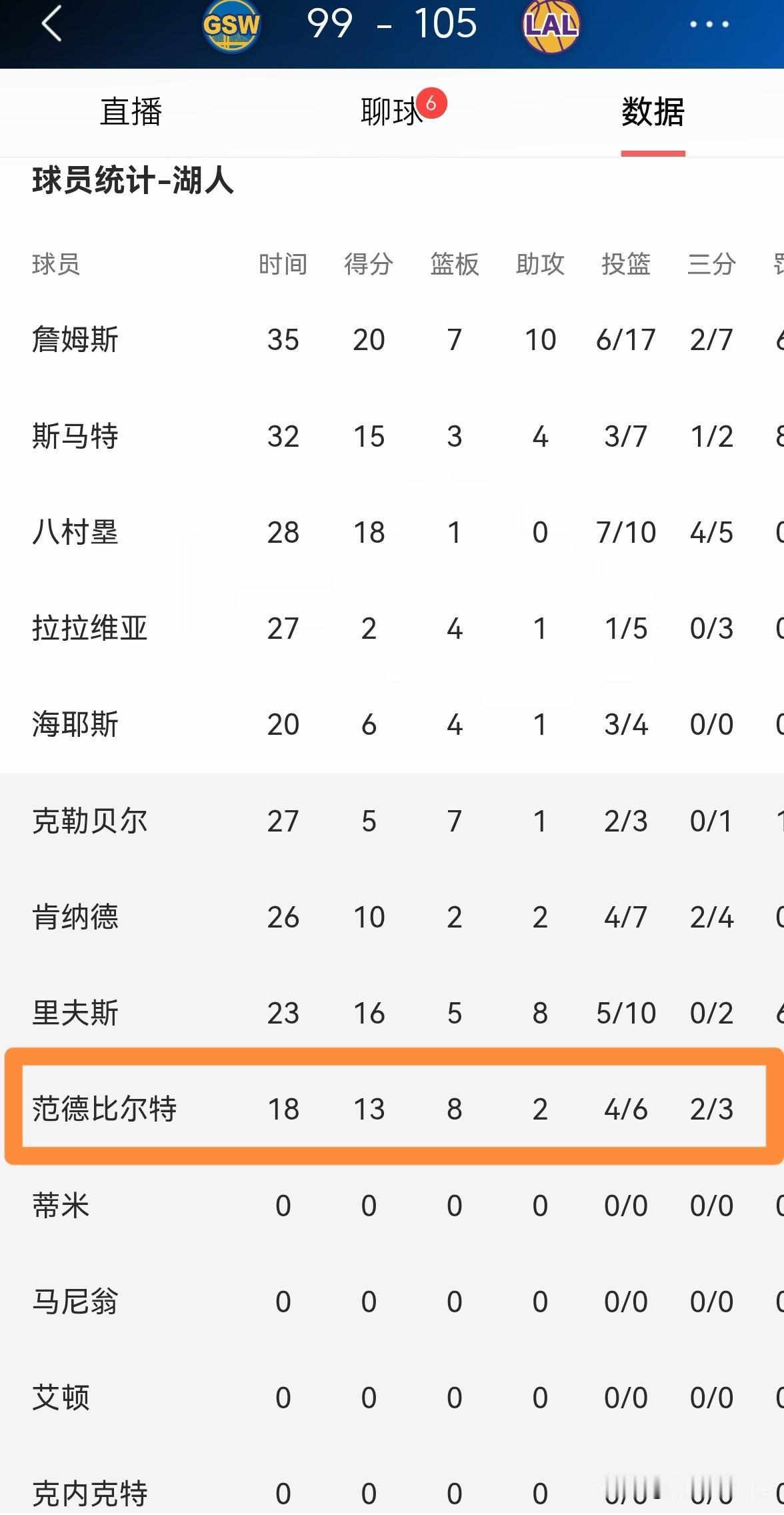 我必须要怒赞湖人悍将范德比尔特!在今天湖人主场以105:99战胜勇士的比赛中,范德比尔特成为了球队的替补神兵,他在攻防两端都打出了可圈可点的表现。 全场比赛下来,范德比尔特替补出战18分钟,投篮6中4,其中三分球2中2、罚球4中3非常高效的得到13分,还有8篮板2助攻2抢断1盖帽,他的场上正负值为+11。 老实说,如果范德比尔特能够在接下来的比赛中延续这样的精彩表现,那么范德比尔特一定能够在湖人站稳脚跟。
