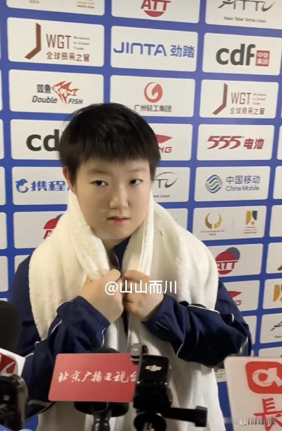 莎莎笑起来好可爱啊。 刚刚的比赛结束后,到了采访区,莎莎见到熟人笑的很开心,应该是小马哥采访的莎莎,莎莎说对于和蒯曼的比赛,自己心态放的非常好。对于决赛还是希望和曼昱会师吧,为大家奉献一场精彩的比赛。现在自己还是抛开成绩,对于曼昱也是下风球,自己还是立足于拼吧,把自己的技战术包括竞技状态呈现给大家吧。莎莎的采访一直都是这么真诚,小女孩对于这次能打进决赛已经很开心了。 这个采访结束后,莎莎来到混采区,今天天气应该是有点凉,昨天的时候莎莎只穿比赛服就来了,今天比赛结束就赶紧穿上外套,到了混采区还把毛巾搭在脖子上,能够保暖,今天打了六局比赛,出汗比较多,这样捂的严实点,不容易着凉。采访结束后,莎莎可以早点回去吃饭了,吃完饭好好休息,晚上还有决赛。 今天就是最后一个比赛日了,明天他们应该就要回北京了,回去后也能有短暂的休息,然后就是备战新加坡大满贯,这次莎莎只打女单的比赛,还能轻松一些。