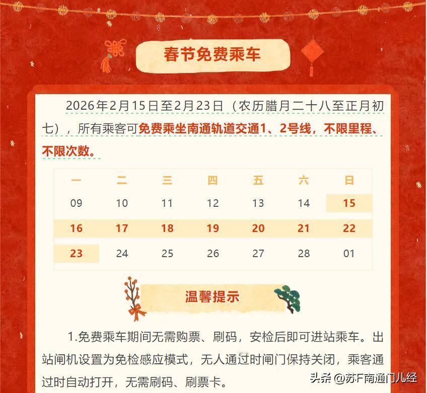 春节假期免费一直是南通地铁的“传统保留项目”,从2023年春节南通地铁运营第一年就开始了。其实地铁票价也就是几块钱,人人坐得起,但免费乘车就是表明一个态度,就是要培育地铁客流。在新线路开工乃至开通之前,南通地铁用时间来培养客流,也许就是一个最好选择了。