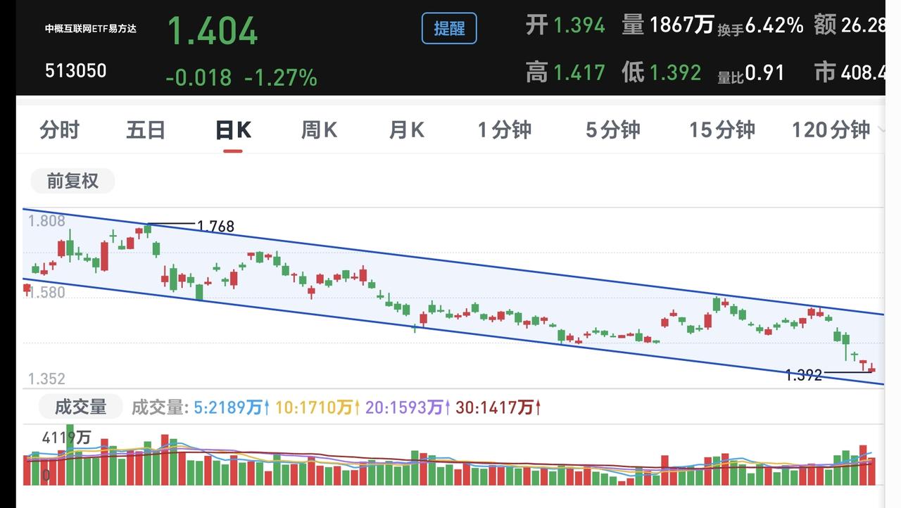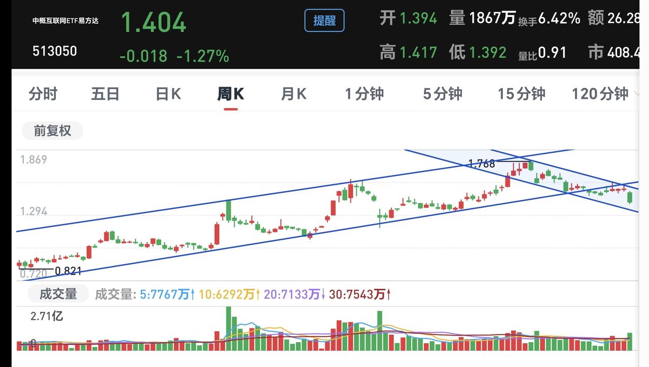 基金:中概互联网板块调整了定投额度 中概互联网基金我持有金额很小,持有了1995元,持有收益7元,持有收益率0.36%,累计收益6524元,前段时间是每天定投10块钱,从下周一开始,我把定投额度调整为每天100块钱。 这只基金我去年9月份也进行过止盈,从止盈的地方到现在的位置有了一定的空间,现在完全可以增加定投额度,由于这只基金原来持有的金额就很小,只要通过增加定投额度,就可以把那次止盈的筹码捞回来。 看下面的截图4,这是中概互联网板块日K线图,现在的位置距离日线级别下跌通道的下轨线比较近,这个地方完全可以增加定投额度。 看下面的截图5,这是中概互联网板块周K线图,前段时间跌破周线级别上涨通道下轨线以后,连续横盘震荡了几周,上周是加速下跌,也来到了周线级别短期下跌通道下轨线附近,这里也是可以增加定投额度的。 这样的操作方式就是慢慢玩,就是等待机会玩,有机会了就玩,没有机会就继续等待,现在并不是进场的机会,现在只是可以调整定投额度的地方。 如果想进场,这个板块需要耐心等待上涨突破周线级别短期下跌通道的上轨线,那个时候可以手动进场。