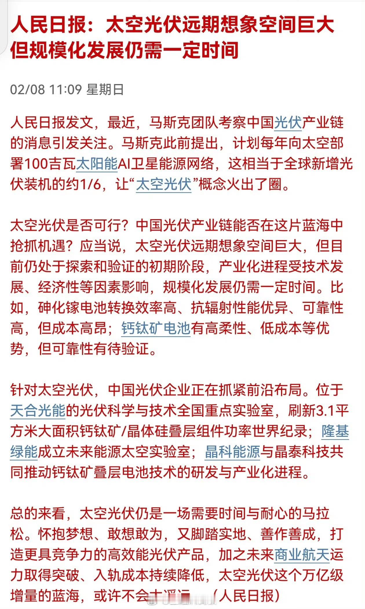 人民日报:太空光伏远期想象空间巨大,但规模化发展仍需一定时间