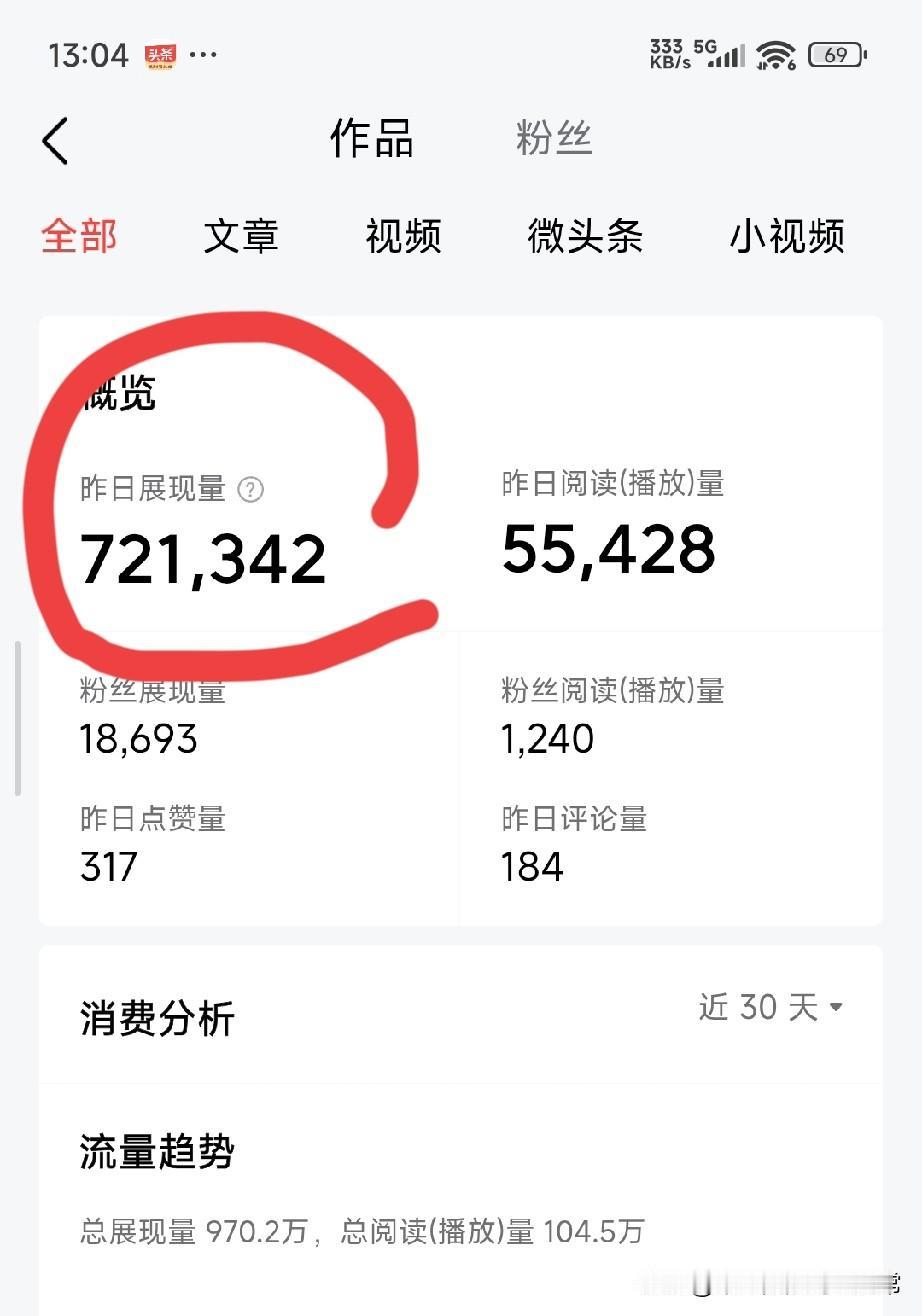 头条爆了!75万流量砸过来 我发现了一个残酷真相 家人们谁懂啊!今天打开后台直接看傻了眼,昨天一条微头条居然干到了72万展现量!刷新了我做号半年来的最高纪录! 盯着那串数字,我手都在抖。但冷静下来一看,心又凉了半截:72万的曝光,阅读量才5万多,粉丝阅读更是只有可怜的1240个。 这说明什么?说明平台给了我泼天的富贵,可我没接住!我一直以为只要内容好就够了,现在才明白,头条的流量密码,根本不止是写得好。 那些说“做好内容就够了”的博主,我现在信你个鬼!我这条爆文,标题用了争议性词汇,开头就放了情绪钩子,才让系统给我推了一波又一波。但粉丝转化率低得可怜,说明我平时和粉丝互动太少,账号粘性太差了。 家人们,你们说我接下来是该专攻爆款内容,还是先花时间把粉丝盘活?评论区聊聊!