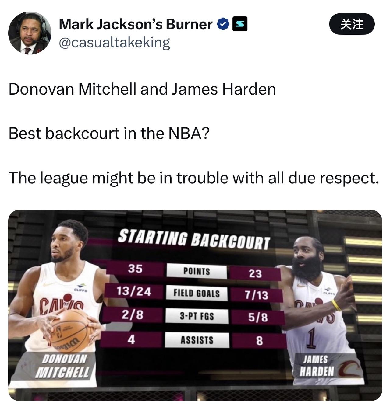 哈登首秀先抑后扬,结局堪称完美! 赛后,前勇士教练马克杰克逊发文写道: 哈登和米切尔是目前联盟最佳后场组合?恕我直言,联盟其他球队可能真的遇到大麻烦了! 确实,哈登首秀的表现,在此前没有与新队友合练过的情况下,远超外界预期! 如果能够稳定这样的表现,等到莫布里回归,那骑士就真的太可怕了! 要知道,除了米切尔35分,哈登23分8助攻之外,阿伦也贡献了29分10篮板,这可是在还没和哈登打出默契的情况下交出的成绩单啊!要是磨合出默契那还得了? 而且,莫布里目前还在养伤,梅里尔在场上就是个累赘,若把这场首发的梅里尔换成莫布里,难以想象! 自己脑补吧! 这也是为什么马克杰克逊会说联盟遇到大麻烦的原因!