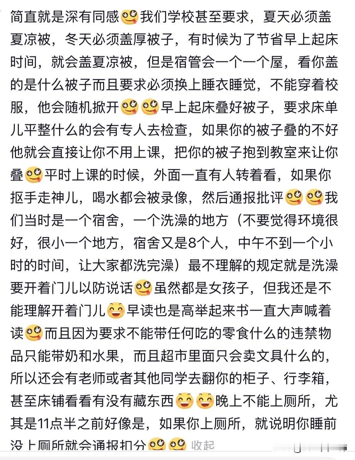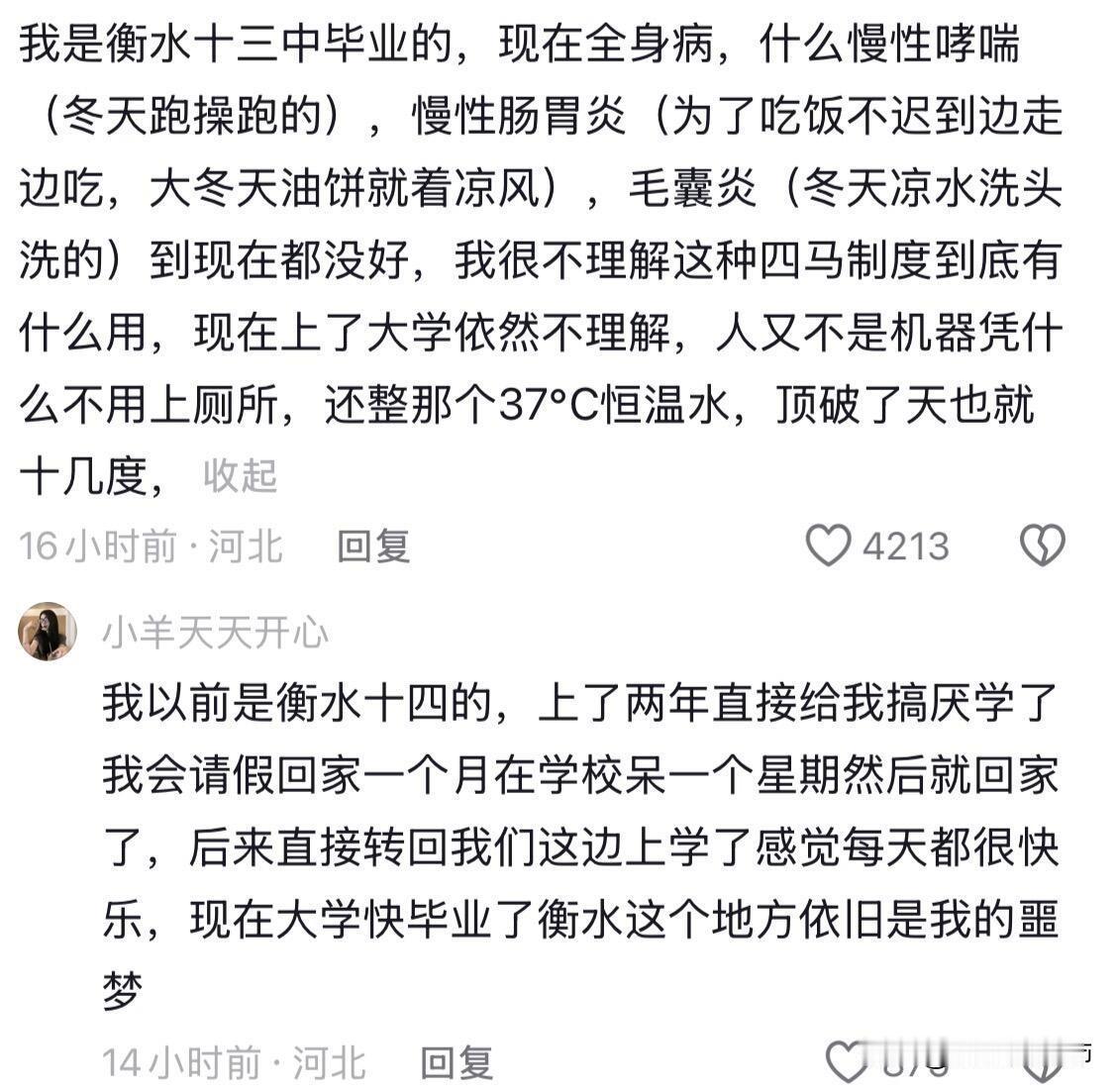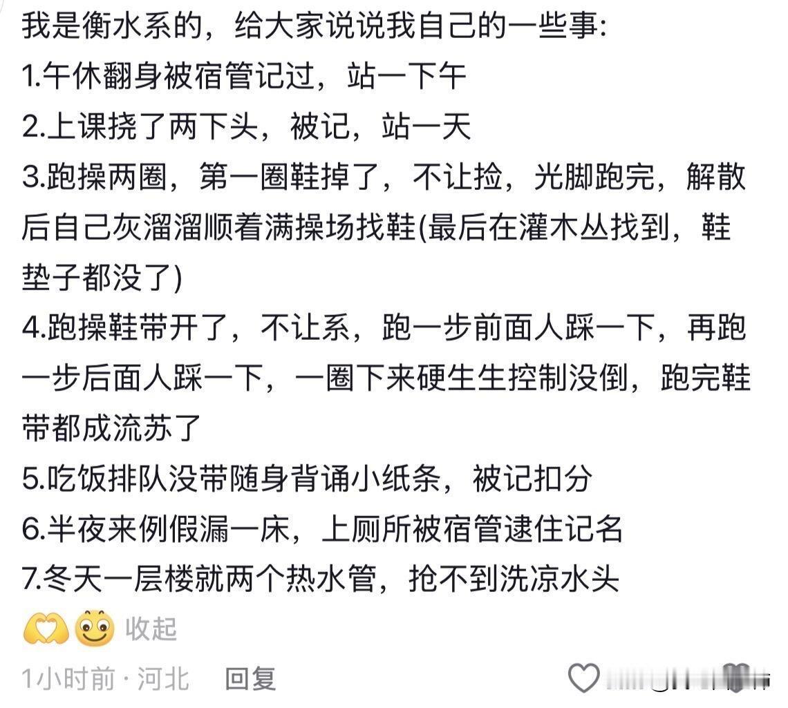 兢兢业业,如履薄冰 看到一个妹妹分享自己在衡水读书的六年,整整30分钟的视频,除了惊掉下巴的内容和评论,一些沉睡的记忆也突然苏醒。 我的初、高中几乎都在山东,虽然不如衡水卷,但也算高考大省,很多老师都把衡水视为榜样,然后贯彻到我们身上。 最大的噩梦是剪头发,每次都是哭着理发,以至于当时的我暗暗发誓,以后坚决不可能让我的孩子去这种学校。结果上大学后天塌了,周围只有我的初高中如此fking日拐。 高中后我有点叛逆。当时分普通班和实验班,我在普通班,可不巧宿舍分到了实验班,诺大的宿舍只有三个人,我和另外两个实验班的学霸。 学霸的确各方面都出色,早睡早起、打扫卫生、按时跑操,而我因为没在本班级的宿舍,几乎没参加过早上的跑操,每天想尽一切办法赖床。 结果就是宿舍检查经常不合格,宿管都到门口了,我还在穿衣服,被子床铺一团糟。 实验班的班主任很快就忍不了了,把我叫去谈话,说我老鼠💩坏了一锅粥,所有同学都兢兢业业如履薄冰,只有我不当回事。 可是叛逆高中生才不会在意这些,他越不高兴我越爽,不反驳不顶嘴,随便敷衍几句,回去继续我行我素,还给他起外号“千年老妖”。最后的结果是我被调回了本班宿舍,但哪怕就是现在回想起来,我当时赖的那一段时间床也是太值了! 这么多年过去,没想到现在还有家长把小孩往火坑里推。