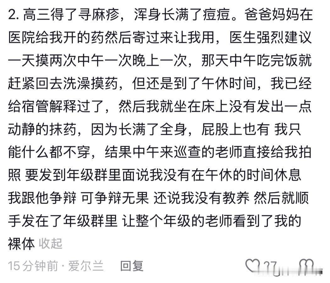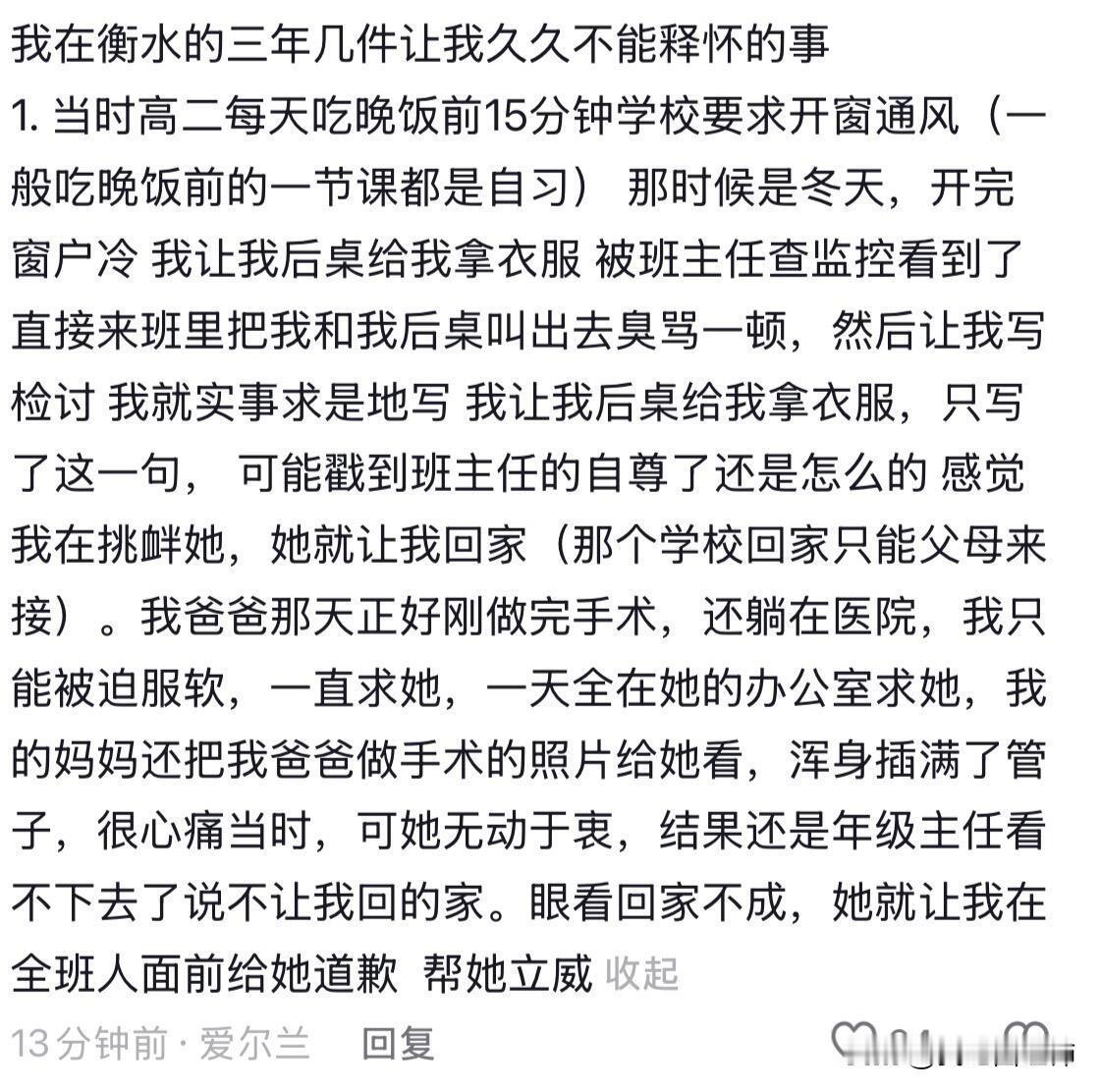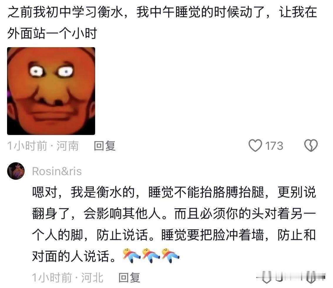 兢兢业业,如履薄冰 看到一个妹妹分享自己在衡水读书的六年,整整30分钟的视频,除了惊掉下巴的内容和评论,一些沉睡的记忆也突然苏醒。 我的初、高中几乎都在山东,虽然不如衡水卷,但也算高考大省,很多老师都把衡水视为榜样,然后贯彻到我们身上。 最大的噩梦是剪头发,每次都是哭着理发,以至于当时的我暗暗发誓,以后坚决不可能让我的孩子去这种学校。结果上大学后天塌了,周围只有我的初高中如此fking日拐。 高中后我有点叛逆。当时分普通班和实验班,我在普通班,可不巧宿舍分到了实验班,诺大的宿舍只有三个人,我和另外两个实验班的学霸。 学霸的确各方面都出色,早睡早起、打扫卫生、按时跑操,而我因为没在本班级的宿舍,几乎没参加过早上的跑操,每天想尽一切办法赖床。 结果就是宿舍检查经常不合格,宿管都到门口了,我还在穿衣服,被子床铺一团糟。 实验班的班主任很快就忍不了了,把我叫去谈话,说我老鼠💩坏了一锅粥,所有同学都兢兢业业如履薄冰,只有我不当回事。 可是叛逆高中生才不会在意这些,他越不高兴我越爽,不反驳不顶嘴,随便敷衍几句,回去继续我行我素,还给他起外号“千年老妖”。最后的结果是我被调回了本班宿舍,但哪怕就是现在回想起来,我当时赖的那一段时间床也是太值了! 这么多年过去,没想到现在还有家长把小孩往火坑里推。