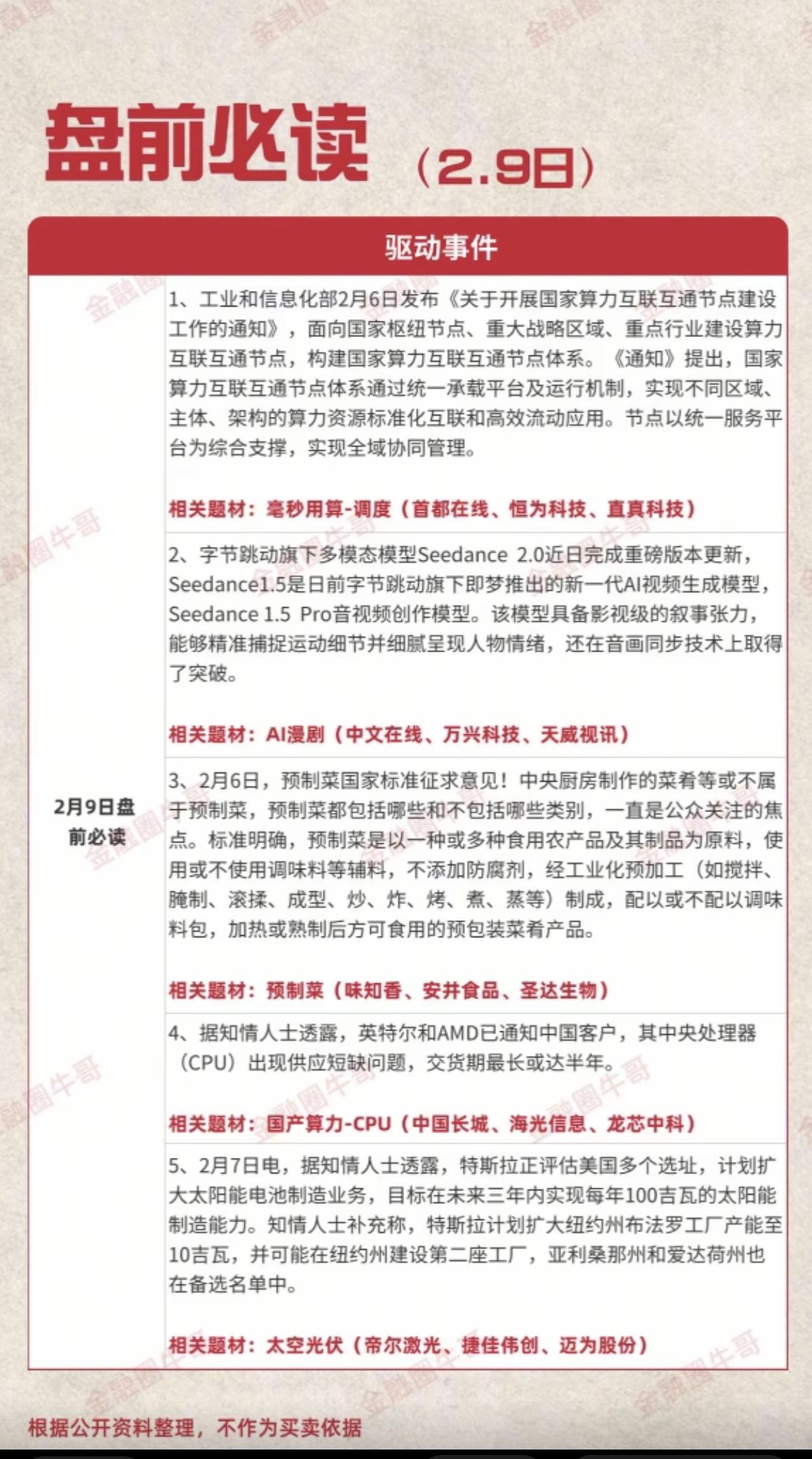 2.9周一 盘前必读! 1.毫秒用算-调度,算力 2.漫剧AI 3.预制菜 4.国产算力-CPU 5.太空光伏