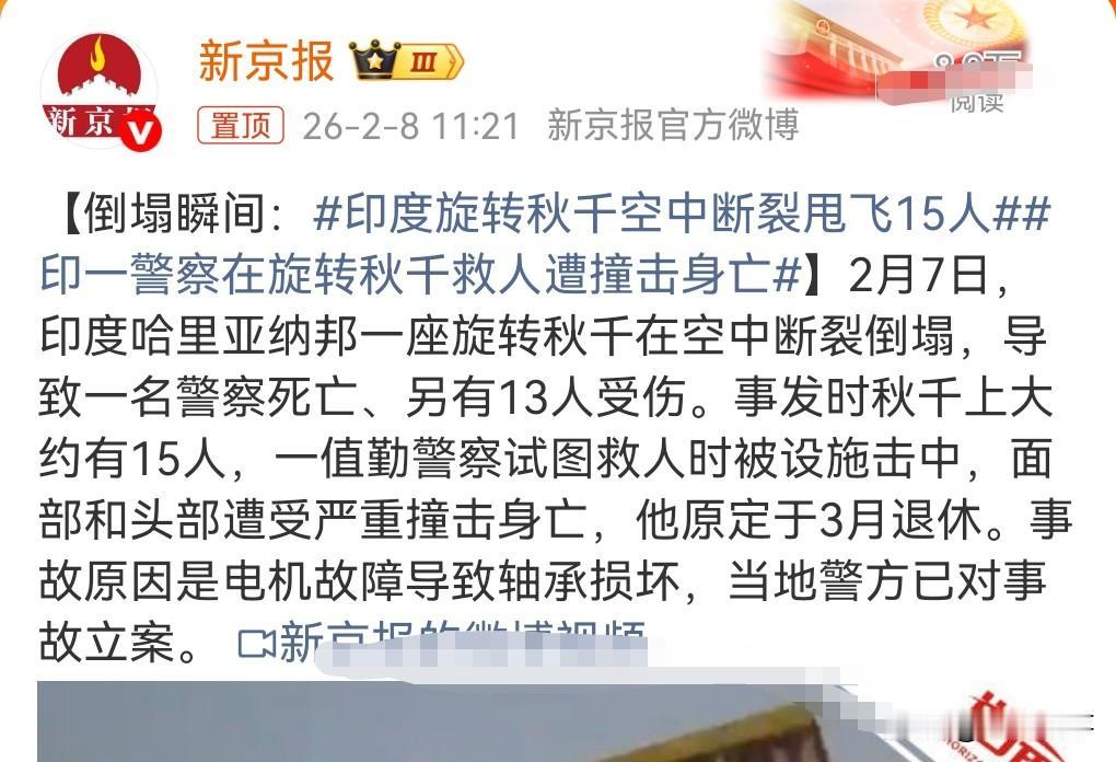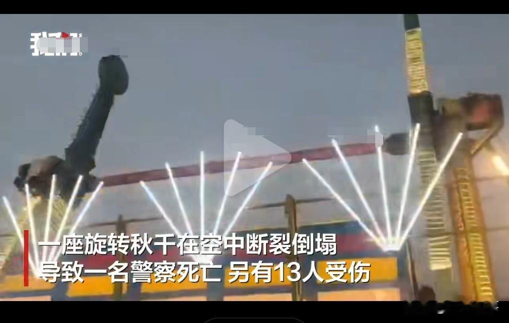 这个秋千设备也太不靠谱了吧,竟然发生这种重大事故。 2日7日印度,一个旋转秋千在空中断裂倒塌。 一名警察是在救人时没想到被撞击了。 该警察不幸身亡。 值得一提的是这个警察原本3月退休的。 这真是悲剧。 事故的原因是电机发生故障导致轴承损坏。 这真是防不胜防啊。 除身亡的警察外,还导致13人受伤。 还是少坐这些娱乐设施。