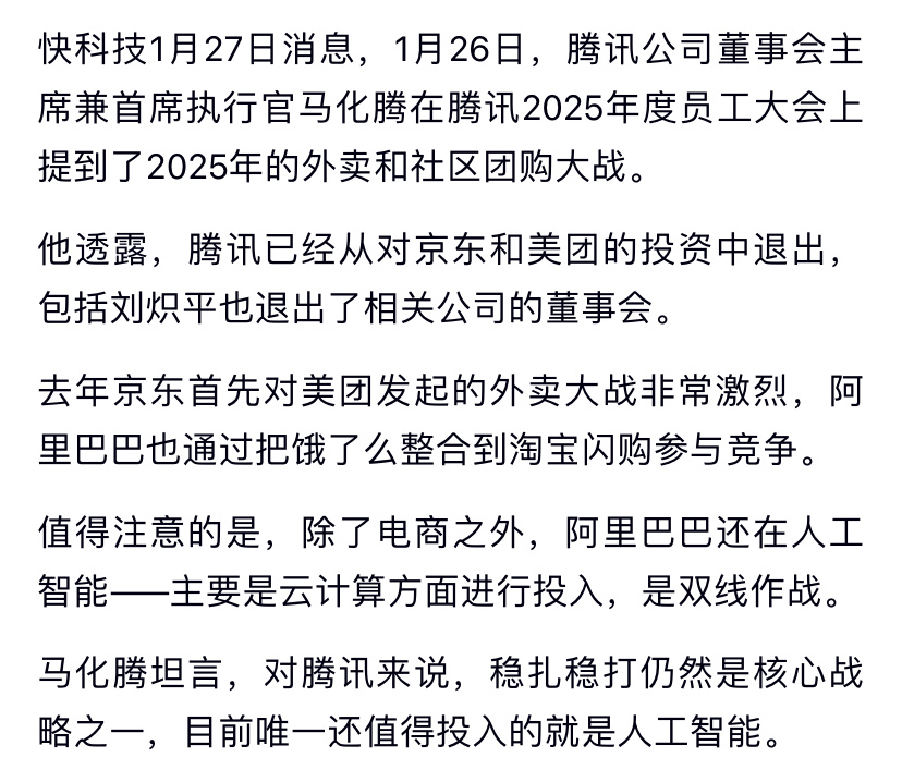 今年鹅厂员工大会上,马化腾透露腾讯已经从对京东和美团的投资中退出了,包括刘炽平也退出了相关公司的董事会。现在看感觉是战略失误了?