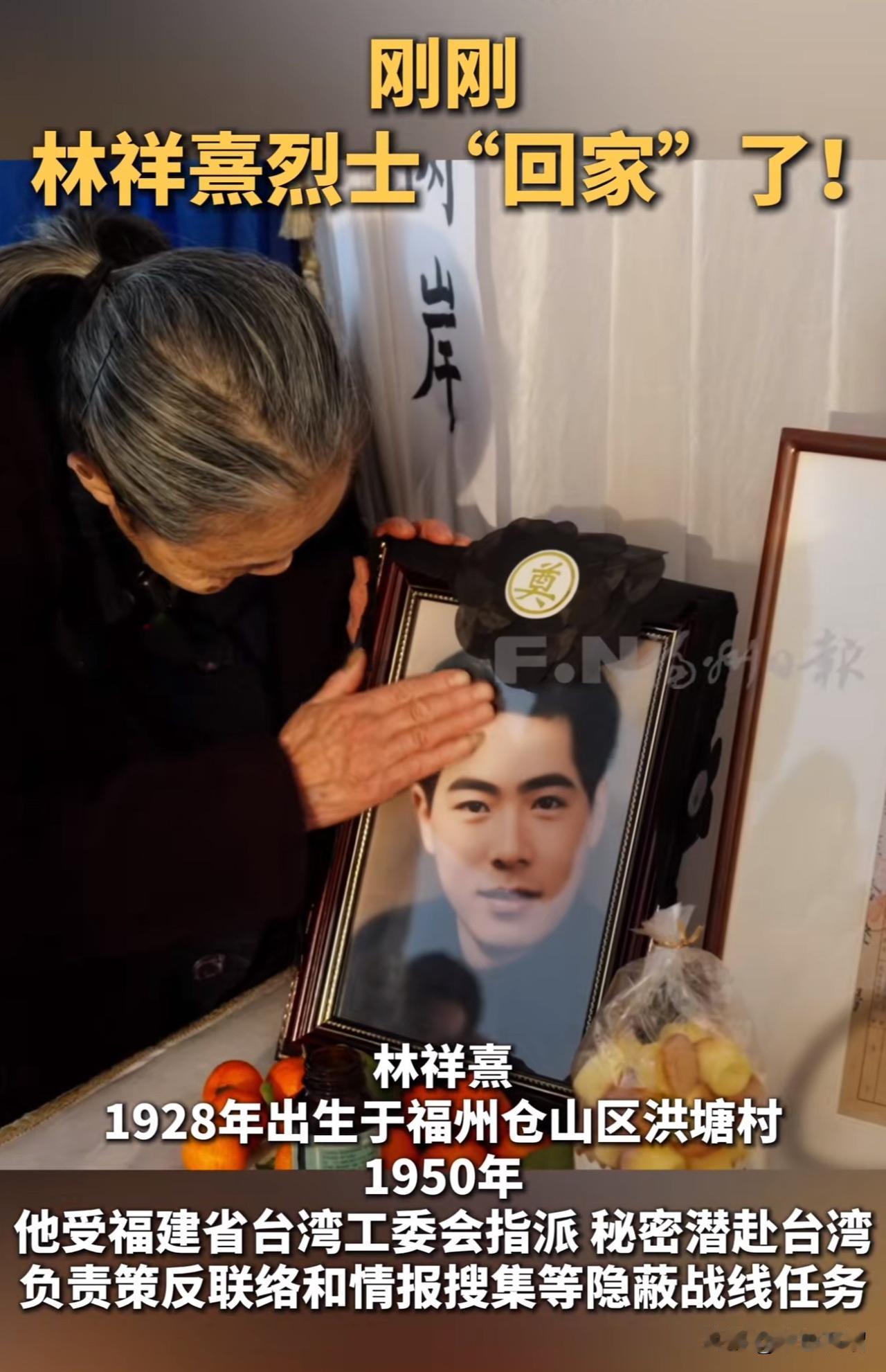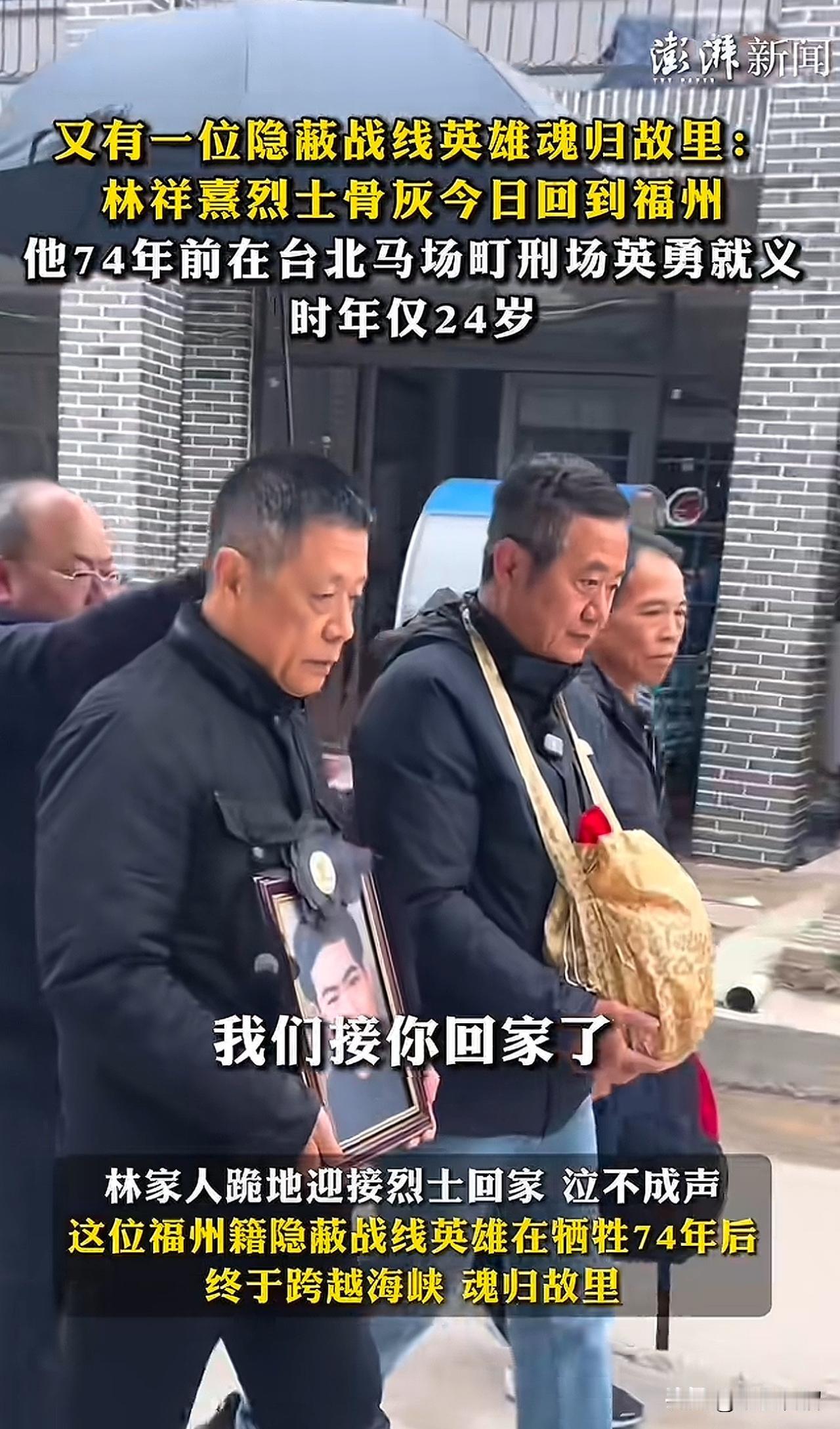 看哭了!英雄的名字应该被更多人知道。 2月7日,在台湾刘德文里长的护送下,历经74年,又一名台湾隐蔽战线上的英雄林祥熹烈士的骨灰回到故乡。 林祥熹烈士1928年出生于福建福州,1950年受当时福建省台湾工委指派秘密潜入台湾,负责策反联络和情报收集等工作。 1951年,他不幸被捕,于1952年在台湾马场町刑场英勇就义,时年才24岁。 1988年,他被中国人民解放军总政治部追认为“革命烈士”。 历经74年,经过多方努力,烈士的骨灰终于魂归故里。林祥熹烈士的妹妹,93岁的林祥仪亲自在门口接哥哥回家。 山河无恙,英雄归故里,林祥熹烈士,这盛世中华,你看到了吗? (图片来源网络)