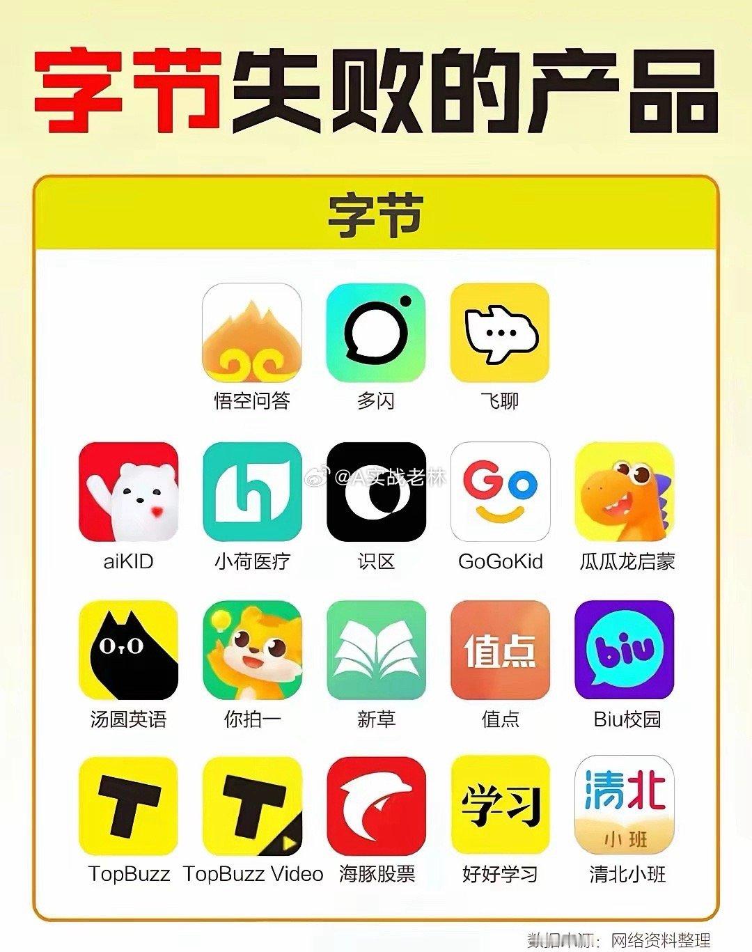 字节跳动旗下失败的产品,抖音巨大的成功,超级大流量,也无法带动字节所有的产品线说到字节跳动可能还是会有人不知道是什么,那么告诉你今日头条,抖音等等都是字节的产品的话,是不是就觉得字节很厉害了,不过就这么厉害的公司,还是会有做失败的产品。字节失败的产品大家最熟悉的应该就是悟空问答,当年应该也是从今日头条里面孵化出去的,大家热衷于在上面提问题和回答问题,然后会有一定的收益,本来应该是对标的百度知道的,后来这种产品都失败了,因为大家有问题可以直接问AI。字节另一个失败的产品就是寄生在抖音里面的社交聊天软件多闪,微信巨大的成功,垄断了社交领域,让很多人都非常羡慕,并且不断的有新的社交软件来挑战,阿里,百度等等,字节也想利用自己抖音的巨大流量切入社交领域,最终还是败下阵来,微信已经让大家根深蒂固了。字节另外失败的产品主要还是在教育领域,尤其是在K12,呱呱龙,GoGokid,清北小班等等,都在政策和自身发展受限的原因下,宣告失败,曾经花了大价钱,大力气,最终没有带来一点点影响,也算是字节旗下最失败的产品了。朋友们,你们觉得字节还会再干社交软件吗?