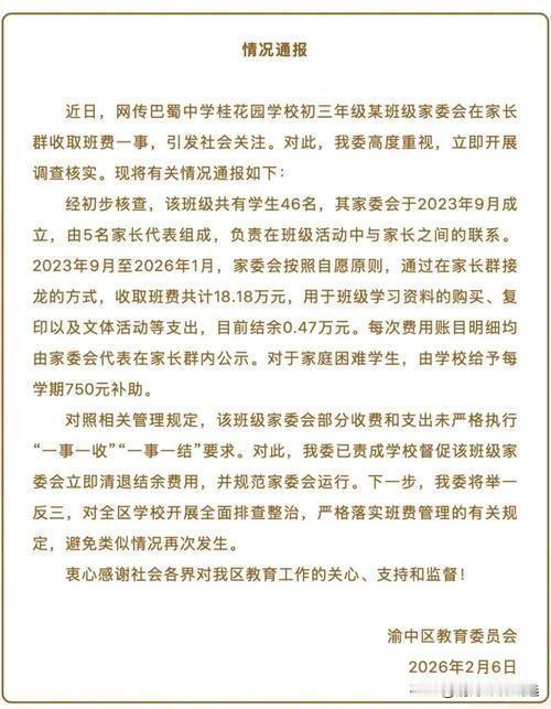 重庆巴蜀中学桂花园学校某班级家委会在两年多时间内,向46名家长收取了总计18.18万元的班费,平均每位家长近4000元。令人震惊的是,最终结余仅剩下不到0.5万元,令人疑惑:这么大金额的资金流向何处?为何结余如此之少?这背后反映出的问题,远远不止数字的冷冰冰。 据悉,家委会的收费方式主要通过家长群接龙“自愿”方式进行,表面上看似“民主自愿”,但实际上并未严格执行“一事一收”的规定,也没有透明的财务公开流程。这种“模糊操作”,让人不禁联想到一些“潜规则”的暗影——家长们的“自愿”是否真的是“自愿”?资金的流向是否合理?结余的少,是否意味着大量资金被挪用或未被合理管理? 渝中区教委已对此事高度重视,责令相关学校和家委会立即清退剩余结余资金,并对家委会的运行机制进行规范。这一行动,彰显了监管部门对家校合作财务管理的重视,也敲响了警钟:家长的每一分钱,都应在阳光下运作,不能成为“暗箱操作”的藏身之地。 这件事折射出一个深层次的问题——家庭与学校的信任危机。家长们投入的每一笔资金,既是对孩子教育的期待,也是对学校管理的信任。而如果资金流向不透明、管理不规范,必然会引发家长的担忧和不满。只有建立起透明、公开、规范的财务体系,才能重建家长的信任,也才能让家校合作走得更远、更稳。 在这场风波中,我们看到的不仅是一次财务的“闹剧”,更是对教育公平、责任与信任的深刻反思。希望未来,所有学校和家委会都能以此为戒,真正做到财务公开、管理规范,让每一份家长的付出都能换来孩子们更美好的未来。
