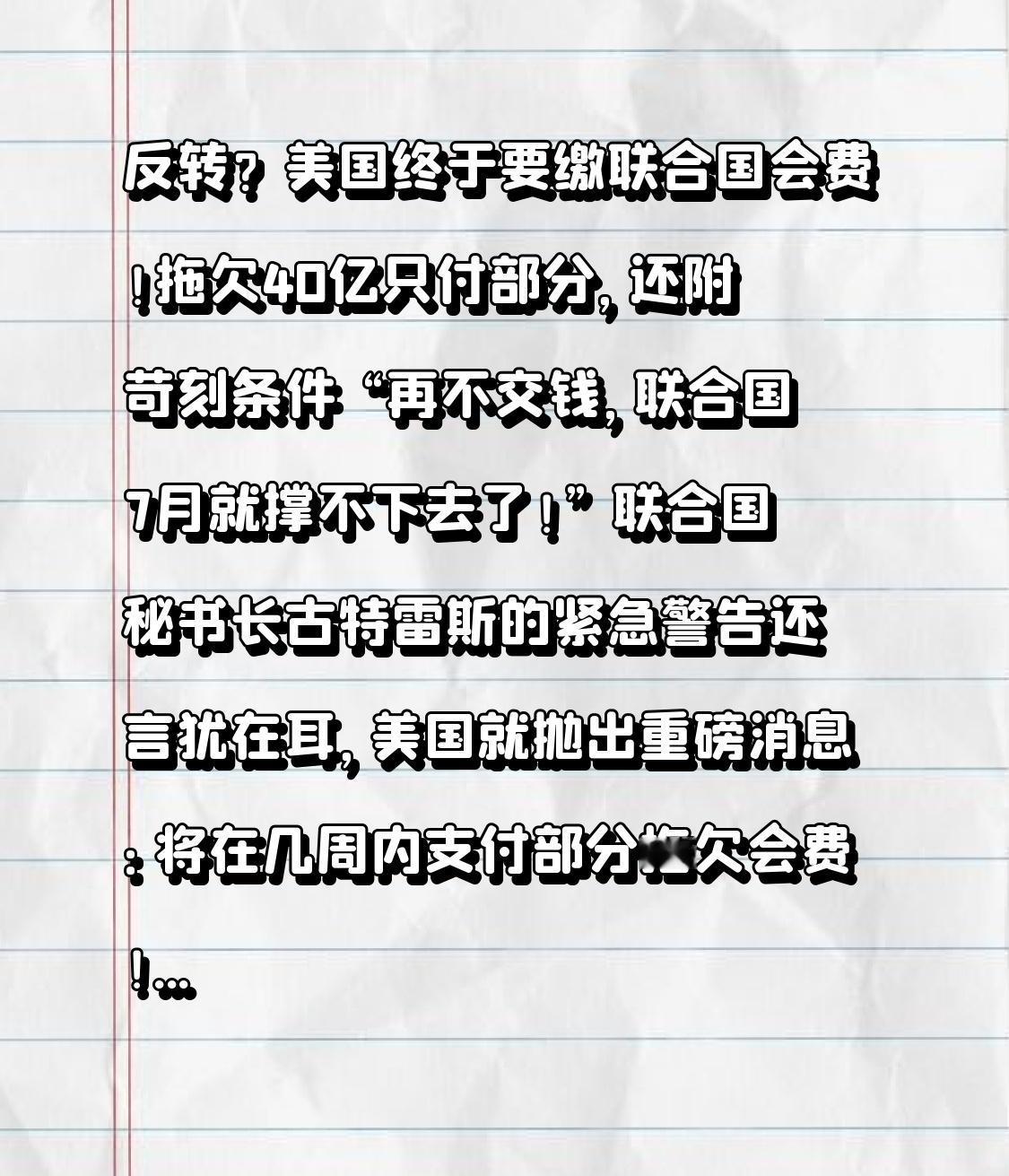 反转?美国终于要缴联合国会费!拖欠40亿只付部分,还附苛刻条件 “再不交钱,联合国7月就撑不下去了!” 联合国秘书长古特雷斯的紧急警告还言犹在耳,美国就抛出重磅消息:将在几周内支付部分拖欠会费!可让人无语的是,这笔“救命钱”不仅只付一部分,还附带了联合国必须推进改革的苛刻条件,网友怒批“这哪里是缴费,分明是趁火打劫”! 当地时间2月6日,美国常驻联合国代表迈克·沃尔兹证实,美国将动用特朗普此前签署的31亿美元国际组织会费法案,向联合国支付一笔“数额可观”的首付款。消息一出,全球瞩目——要知道,作为联合国最大出资方(承担22%常规预算、26%维和预算),美国早已欠成“老赖”,截至2026年2月,累计拖欠常规会费21.9亿美元、维和费用18亿美元,总计超40亿美元,占全球欠费总额的95%以上。 这场财政危机早已迫在眉睫。1月30日,古特雷斯致信193个成员国,直言联合国正面临“迫在眉睫的财政崩溃”,现有预算7月前将彻底耗尽,维和行动、人道主义援助等核心职能都将停摆。更严重的是,根据《联合国宪章》第十九条,美国拖欠款项已远超前两年应缴总额,本应丧失联大投票权,却因安理会常任理事国身份“豁免”,引发多国不满。 可第一个转折点充满霸权逻辑:美国的“缴费”并非真心履约,而是带着明确的政治筹码。沃尔兹直言,后续款项的拨付,取决于联合国是否持续推进“内部改革”,还抱怨古特雷斯的“联合国80周年改革”计划“推进太晚”,声称要让联合国“回归和平与安全核心职能”,停止“为所有人做所有事情”。言外之意很明显:不交钱是施压,交部分钱是为了让改革按美国的节奏走,这哪里是履行成员国义务,分明是把会费当成了操控国际组织的工具。 更讽刺的是第二个转折点:中美缴费态度的鲜明反差。就在美国拖欠巨款、漫天要价的同时,中国作为第二大会费国,早已在2025年10月一次性缴清全年6.8573亿美元常规会费,联合国副发言人还专门用中文致谢,称赞中国的履约为困境中的联合国注入信心。一边是拖欠40亿只付部分还附条件,一边是按时足额全额缴纳,两相对比,谁在坚守多边主义、谁在奉行霸权逻辑,一目了然。 美国的算盘其实不难懂。特朗普政府上台后,一边掀起“退群潮”,已退出66个国际组织(含31个联合国实体),一边恶意拖欠会费,本质是想通过“断粮”削弱联合国影响力,推动建立更符合“美国优先”的国际秩序。可这种单边操作,受伤的终究是全球弱势群体——一旦联合国资金枯竭,中东、非洲的维和行动将停滞,饥饿、战乱地区的人道主义援助将中断,无数普通人的生计会陷入绝境。 网友们的评论一针见血:“欠账还钱天经地义,还敢提条件?”“美国不是交不起,是不想交,想逼联合国听话”“多边体系不是美国的后花园,不能想怎么拿捏就怎么拿捏”。事实上,联合国改革确实必要,但改革的主导权应属于193个成员国,而非被单个国家用欠费裹挟,更不能沦为服务单边利益的工具。 这场会费风波,早已超越单纯的“欠钱还钱”,成为对多边主义的一场考验。美国若真心想维护联合国的作用,就该足额补缴欠款,而非附带政治条件;国际社会更应凝聚共识,坚守《联合国宪章》精神,不让单边霸权动摇全球治理的根基。 你觉得美国的“附条件缴费”合理吗?联合国该如何摆脱被资金绑架的困境?点赞转发,一起聊聊这场牵动全球的国际博弈,也愿多边主义能守住底线,让联合国继续成为维护和平、守护弱者的重要平台!