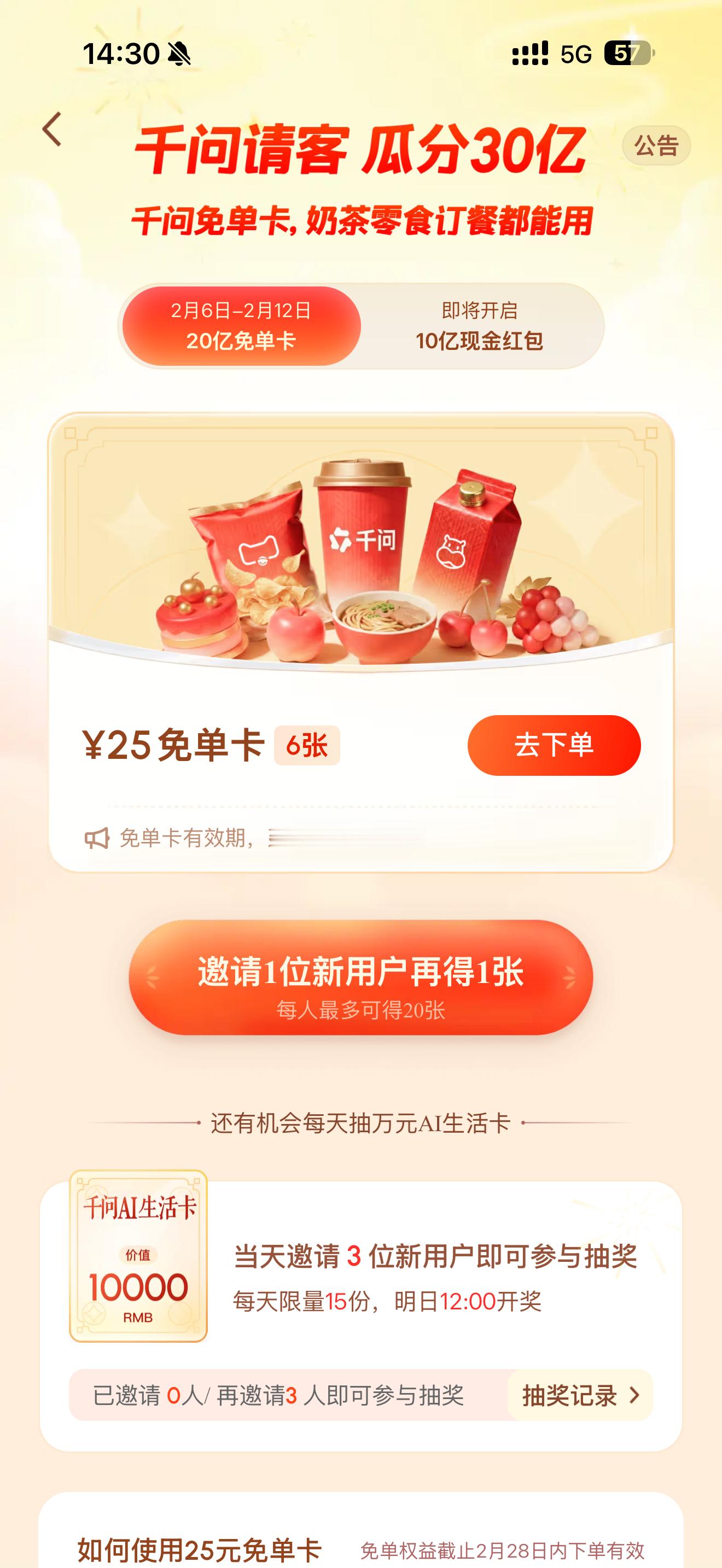 千问这波真实在,30亿请全国人民吃喝玩乐,只要下载千问APP,必得25元免单卡,人人都可以参与,盒马生鲜、外卖平台都可以使用,过年回家,还可以用来买年货。