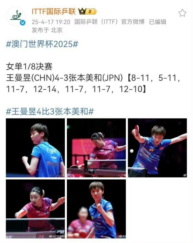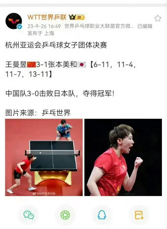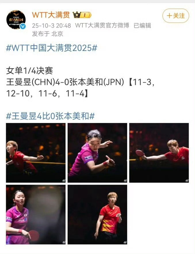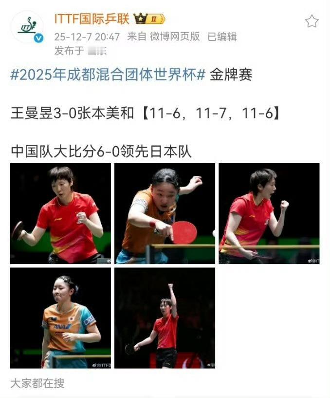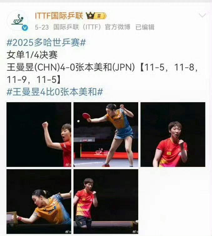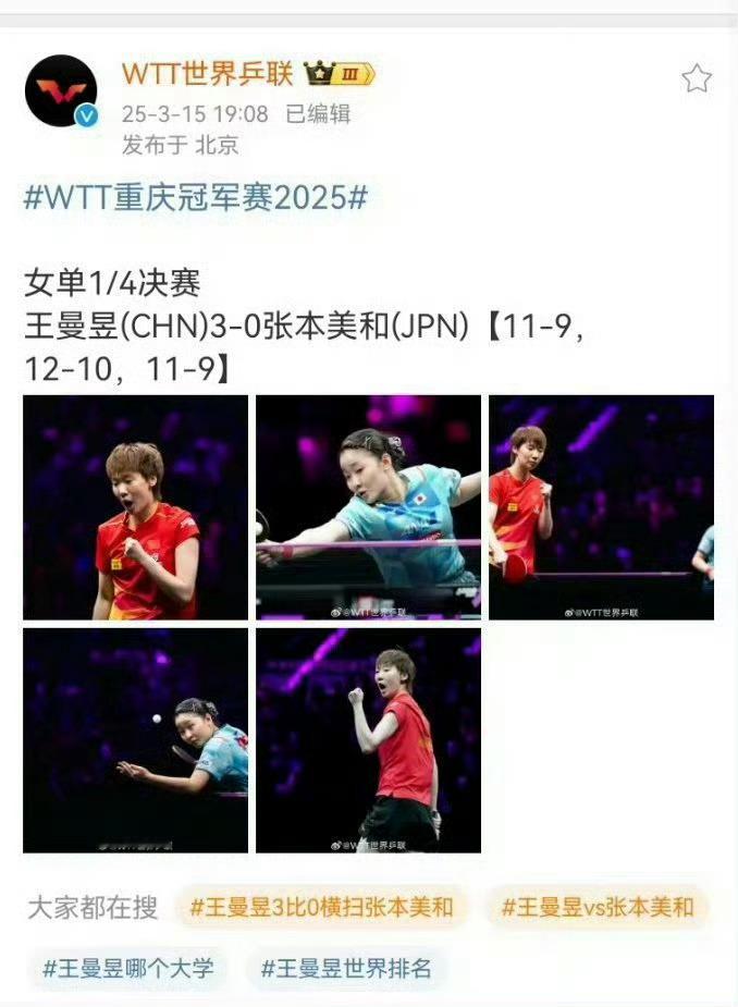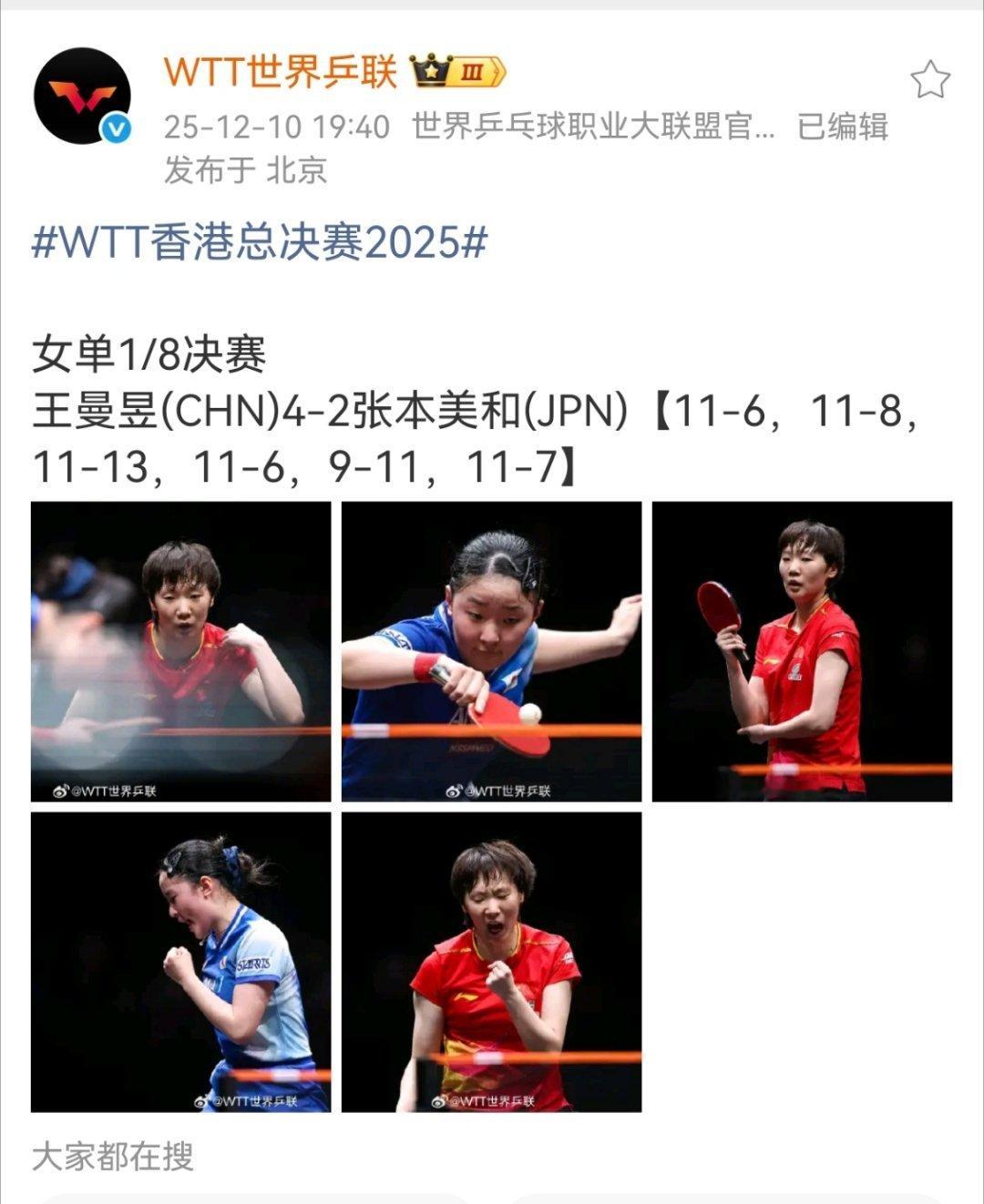 王曼昱VS张本美和生涯第🔟次交手从2023年杭州亚运会王曼昱第一次交手张本美和到两届澳门世界杯战胜对手再到巴黎奥运会的取胜重庆冠军赛的取胜再到多哈的世锦赛横扫再到北京大满贯完胜!再到成都混团横扫对手香港总决赛4-2战胜对手海口亚洲杯4-2战胜对手王曼昱守住了国球荣耀日本队还未攻破的最后一道防线【这个交手的记录比中彩票还难,希望ctta明白,这是你们最后一块遮羞布】
