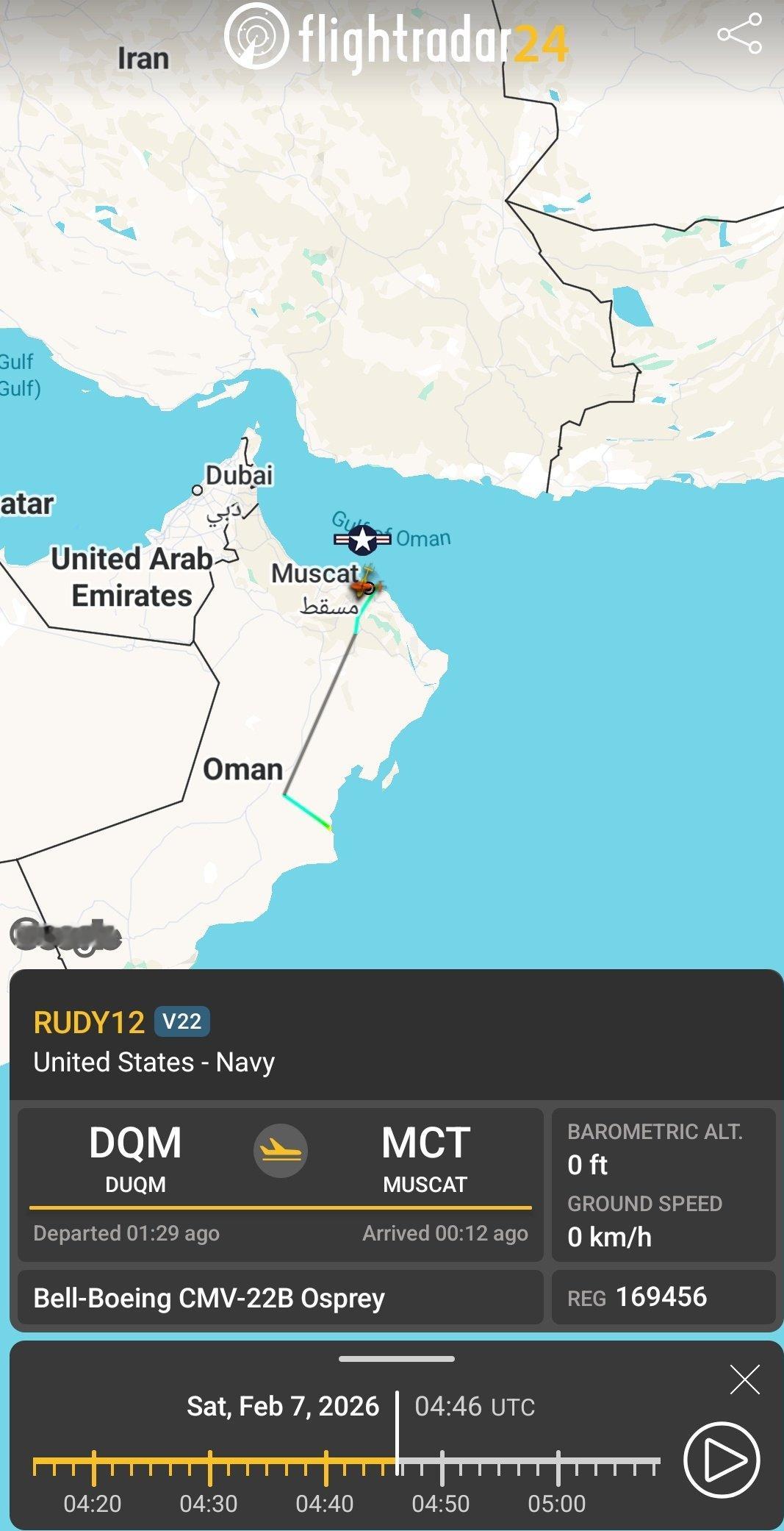 🔻亚伯拉罕·林肯号航空母舰已进一步北行,根据F24数据,CMV-22B 运输机(编号 169435 与 169456)从杜库姆转场至马斯喀特,随后飞抵航空母舰(图1-2)。🔻美国媒体报道:今日,库什纳、威特科夫与中央司令部指挥官库珀登上美国海军亚伯拉罕·林肯号(图3-5)。🔻图6-9是2月6日拍的。伊朗与美国恢复核谈判热点现场海外新鲜事