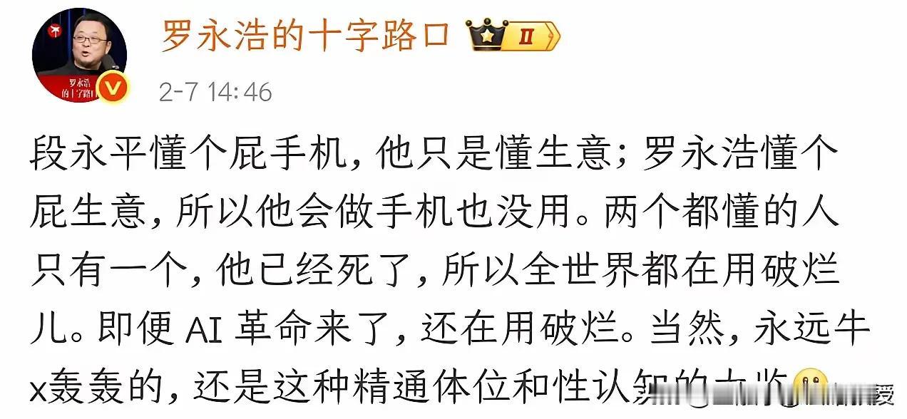 真的想不到啊!刚刚看到,罗永浩竟然会喷段永平不懂手机?这两个人完全没交集啊! 刚喷完贾国龙的罗永浩,又把矛头对准段永平,暗讽他不懂手机只懂生意,还不忘把乔布斯抬出来。说现在全世界都在用破烂,但段永平一手创办的OPPO、vivo,全球销量常年稳居前三,硬实力摆在眼前。 段永平这位浙大无线电系毕业的技术派,早年靠小霸王、步步高奠定江湖地位,做手机从供应链到渠道全链路打通,“不懂手机”的说法实在站不住脚。 如果段永平回怼,大概率会是一句:“我不懂手机,但我懂怎么让几千万人用得上好手机;你懂手机,可你的手机现在在哪里?” 不知道罗永浩这次争锋相对的吐槽,是不是为了流量?