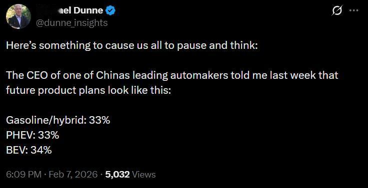 中国一家车企的CEO最近向Michael Dunne(专注全球电动车、电池和自动驾驶市场洞察的顾问)透露,他们未来的产品规划是这样的: 燃油/混动:33% 插电混动(PHEV):33% 纯电动(BEV):34% 大家觉得这个车企是哪家?