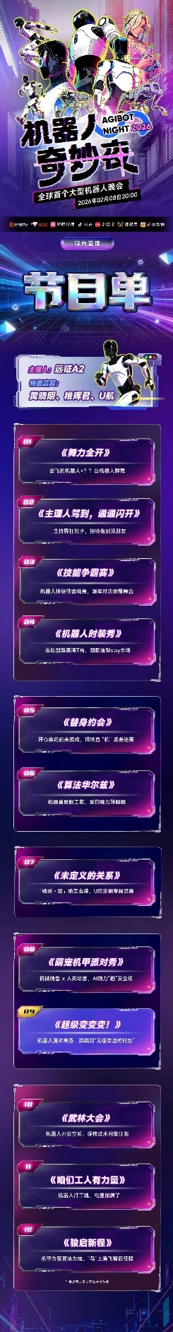 #全球首个大型机器人晚会#《机器人奇妙夜》节目单来了,大家可不要小看这个全球首场机器人晚会,通过看节目单就知道,这些节目对于机器人的综合能力,又是一次极限的考验。我觉得目前人形机器人,最擅长的是语言沟通和舞蹈动作能力。比如开场第一个节目就是《舞力全开》,第二个节目,机器人居然要当主持人?