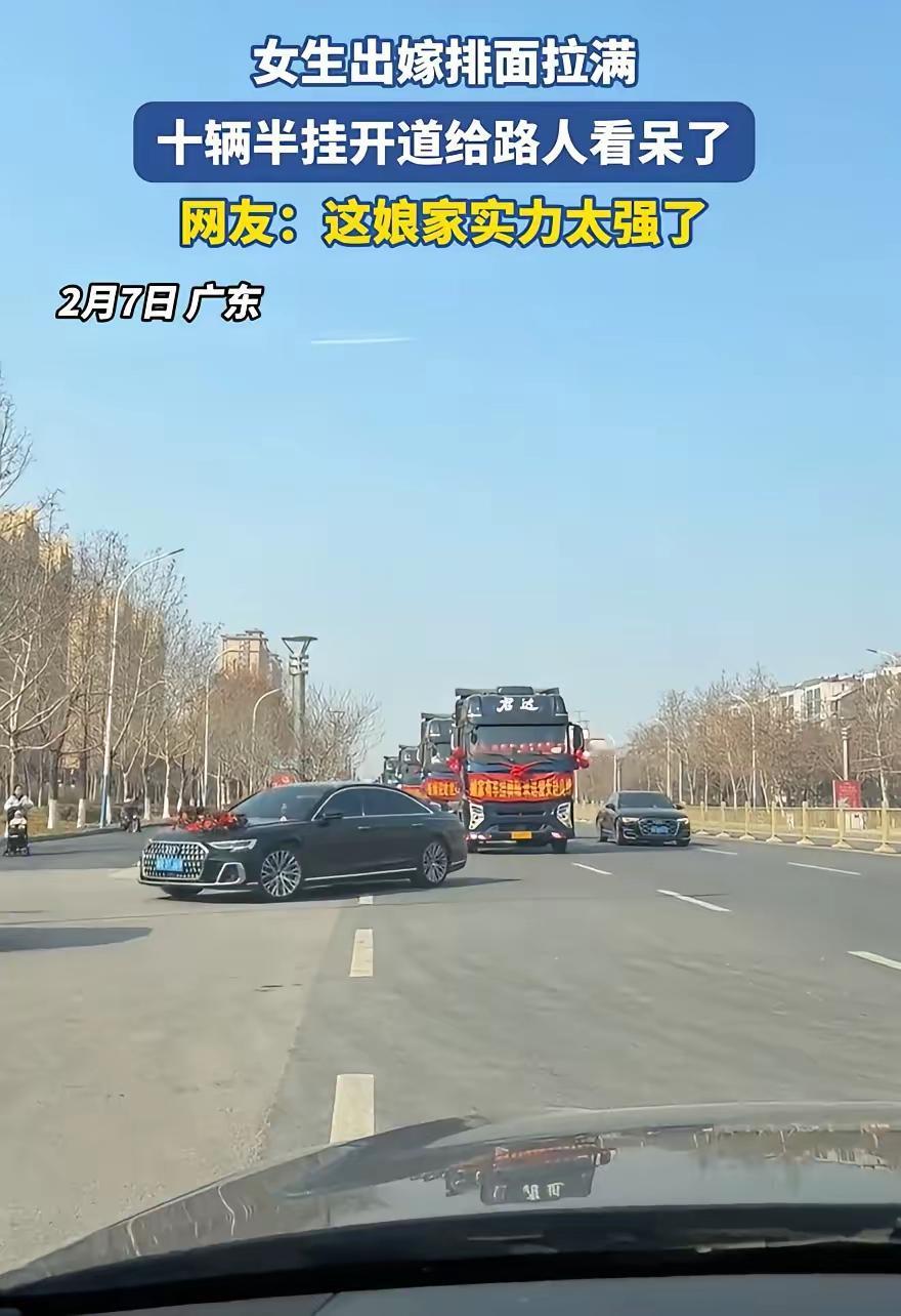2月7日广东一女生出嫁,十辆半挂车开道迎亲,排场惊艳路人,据悉新娘为公司财务,这些半挂车是公司提前出动为其撑场面,车身仅挂祝福横幅无其他装载,该婚车搭配还被赋予“今后一路开挂”的美好寓意。 这一别样的迎亲方式引发网友热议,有人认为此举无意义,半挂车空车出行还可能堵塞交通;也有人觉得结婚本是喜事,想热闹些无可厚非,且能让众多员工捧场,足见新娘人品不错。 此外,半挂车当婚车并非个例,濮阳、安徽淮北等地均出现过类似情况,淮北的这场婚礼中,新人选用半挂车迎亲,是因双方父亲均为半挂车司机,对他们而言这一形式有着特殊意义。